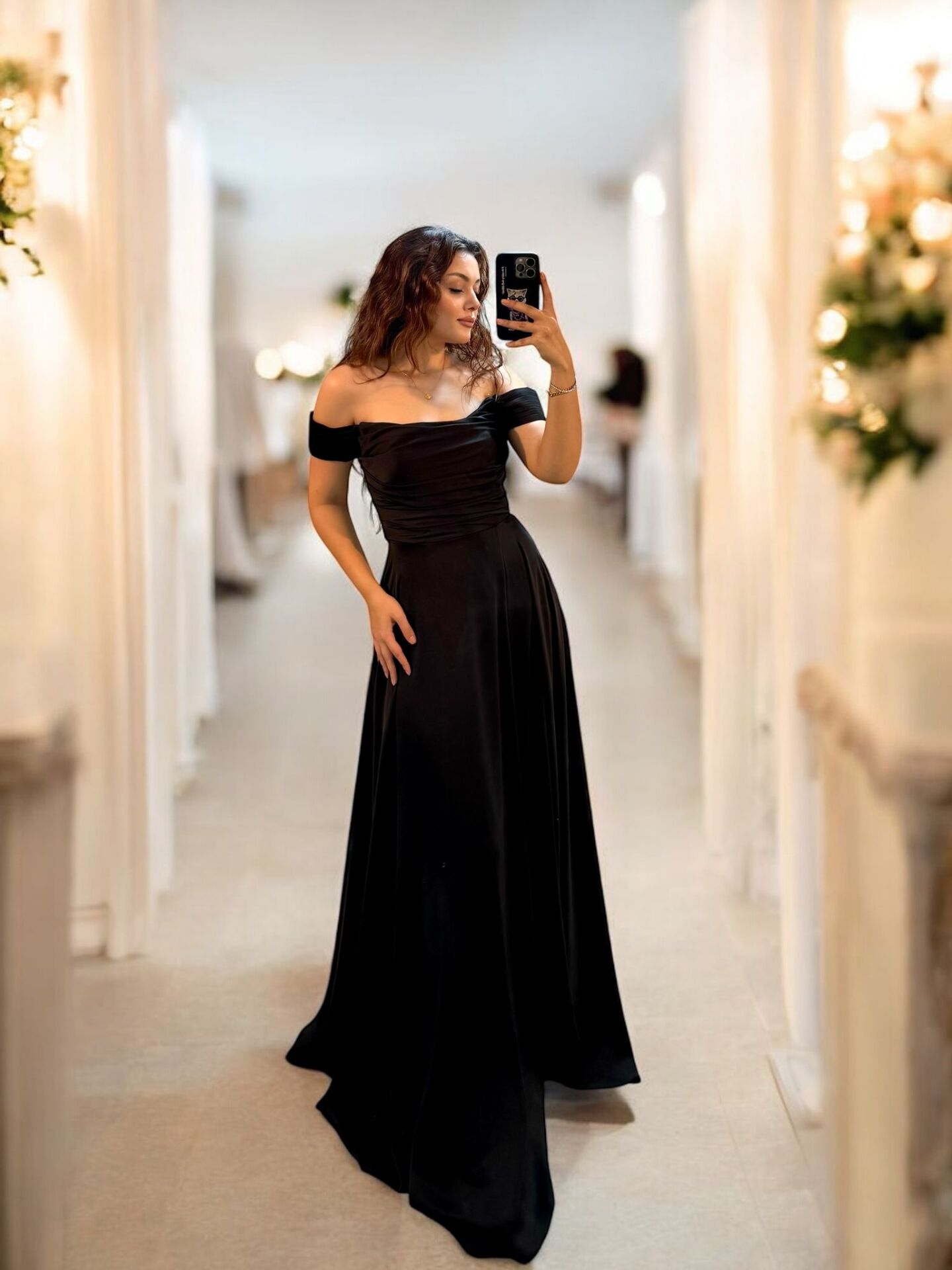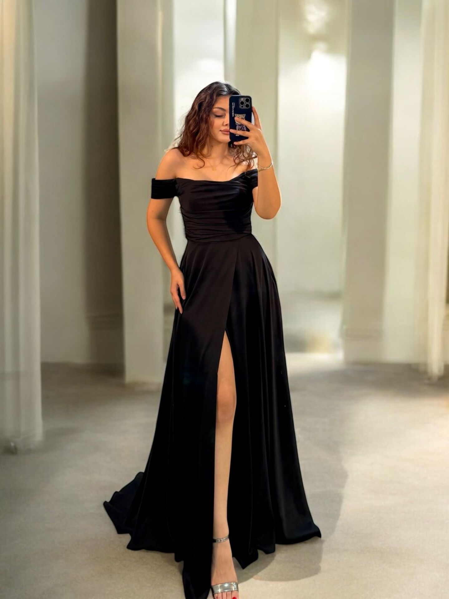 Nuvya Akıcı Saten Düşük Omuzlu Siyah Renk Yırtmaçlı Abiye Elbise