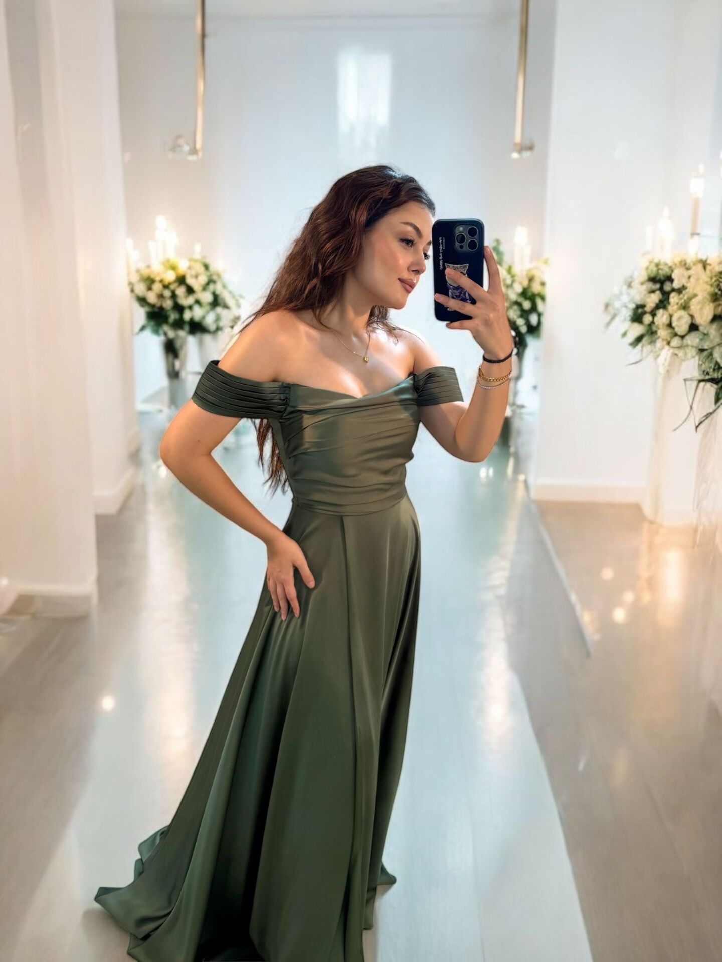 Nuvya Akıcı Saten Düşük Omuzlu Yeşil Renk Yırtmaçlı Abiye Elbise 36