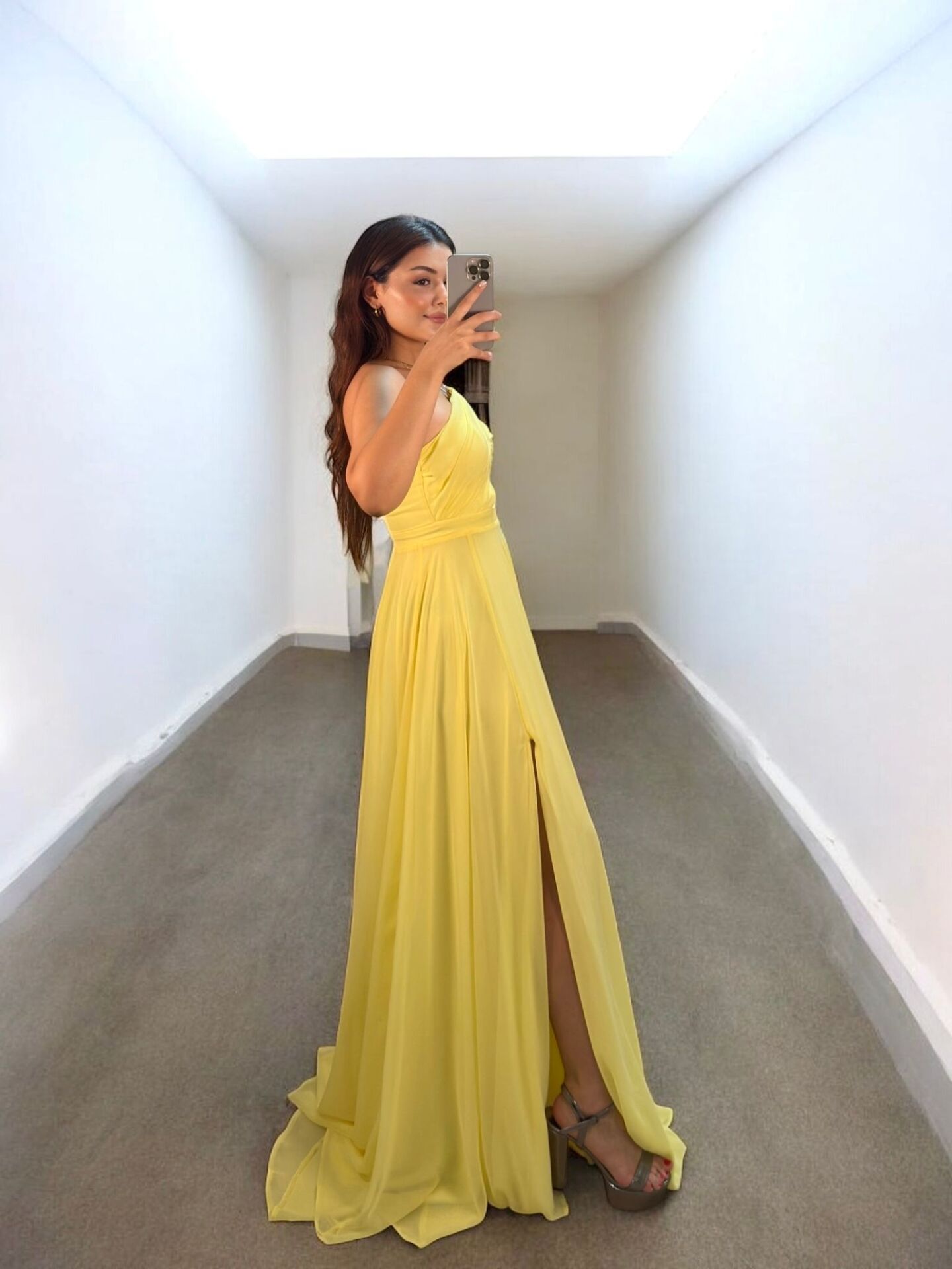 Alya Gold Tokalı Şifon Yırtmaçlı Butter Yellow Abiye Elbise