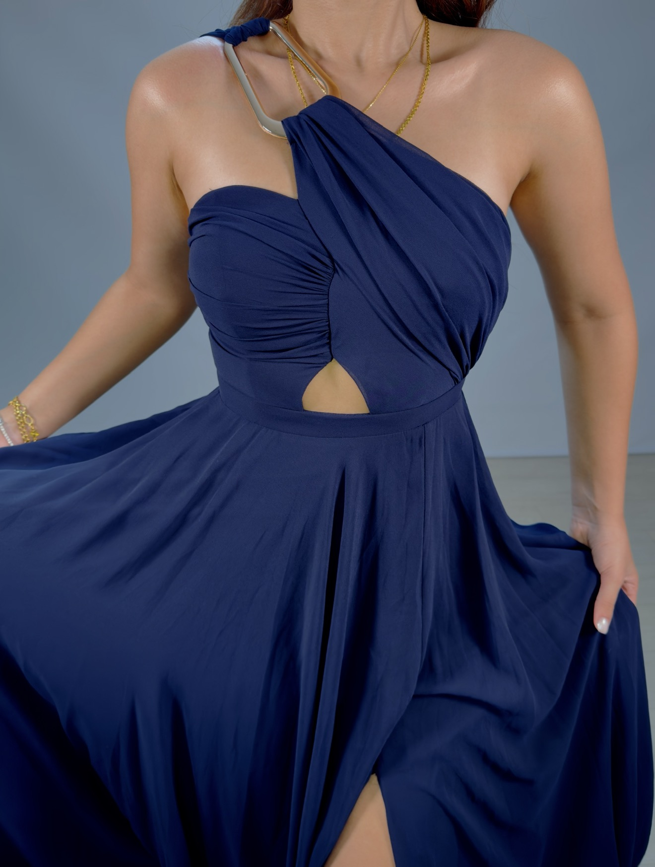 Alya Gold Tokalı Şifon Yırtmaçlı Lacivert Abiye Elbise 44