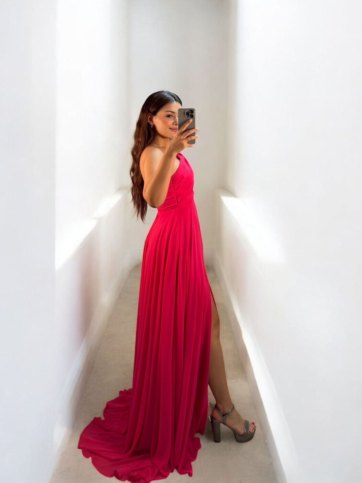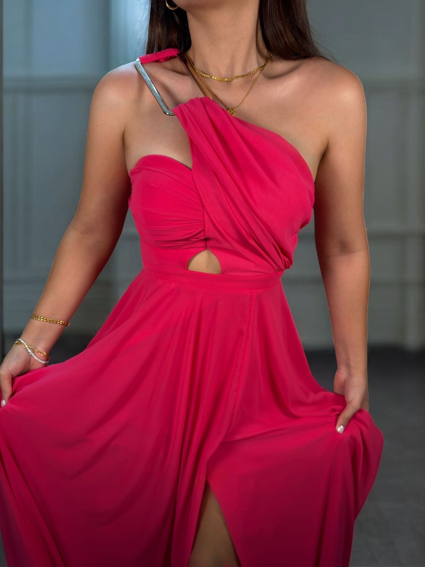 Alya Gold Tokalı Şifon Yırtmaçlı Pembe Abiye Elbise
