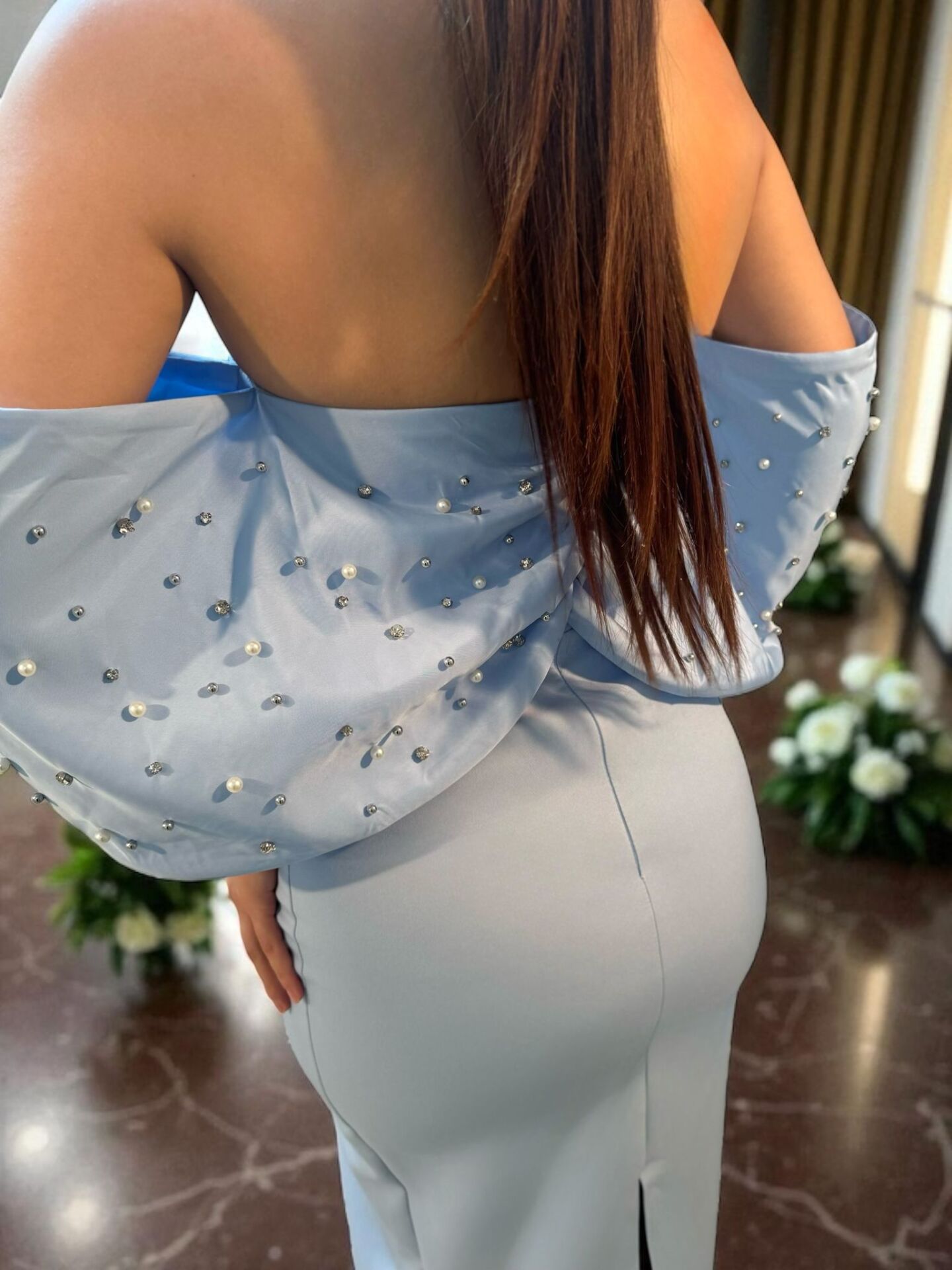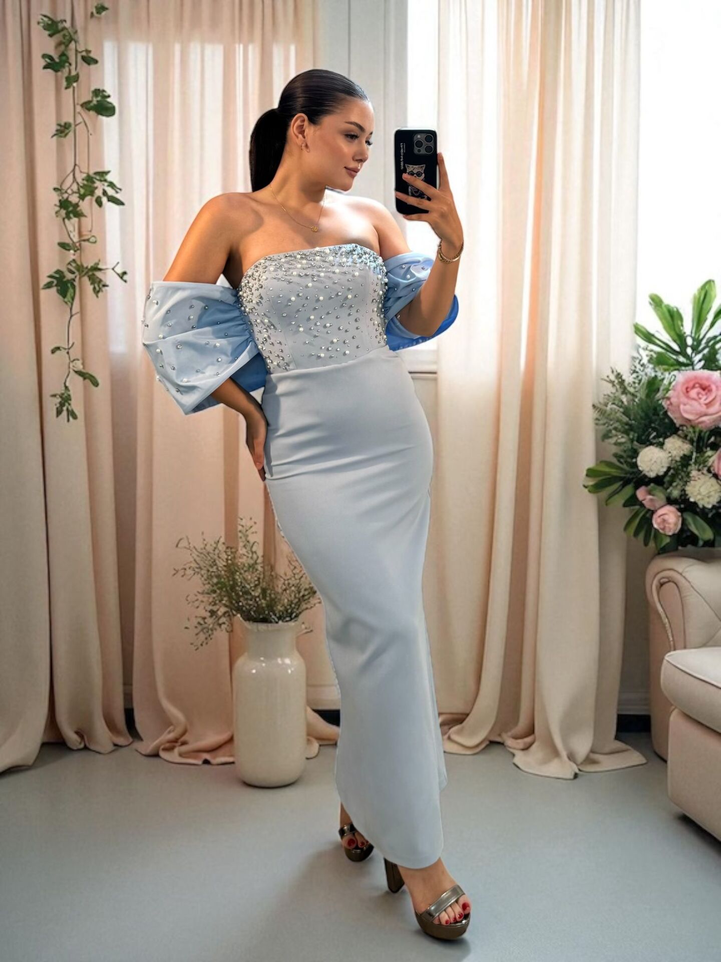 Zarif inci ve taş işlemeleriyle göz kamaştıran bilek boy abiye elbise kesimi, bebe mavisi rengi ve dikkat çekici tasarımı ile her gözü size çevirecek.
