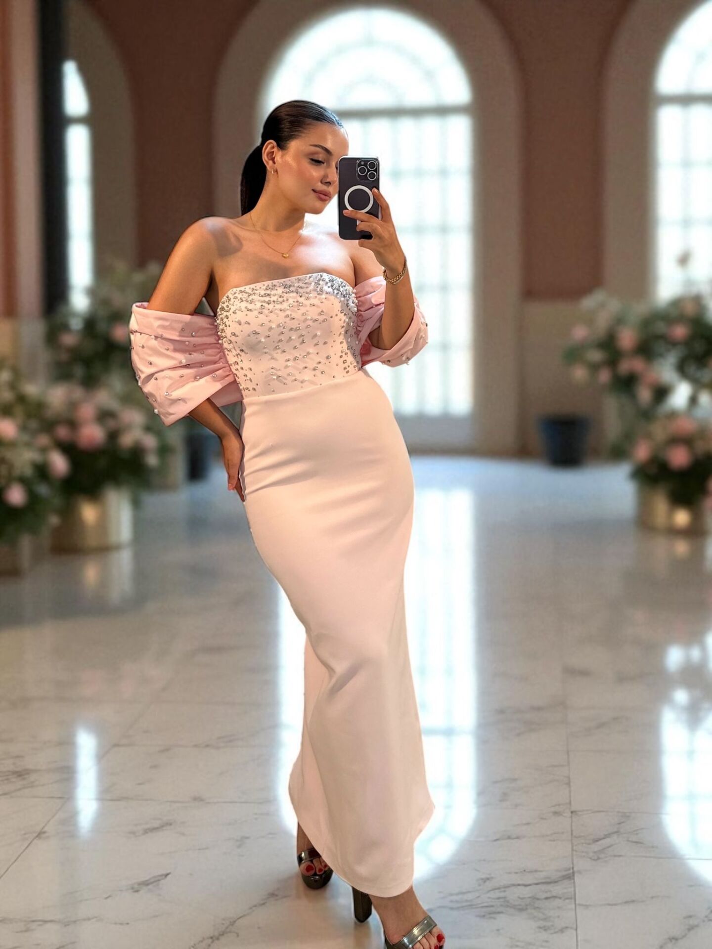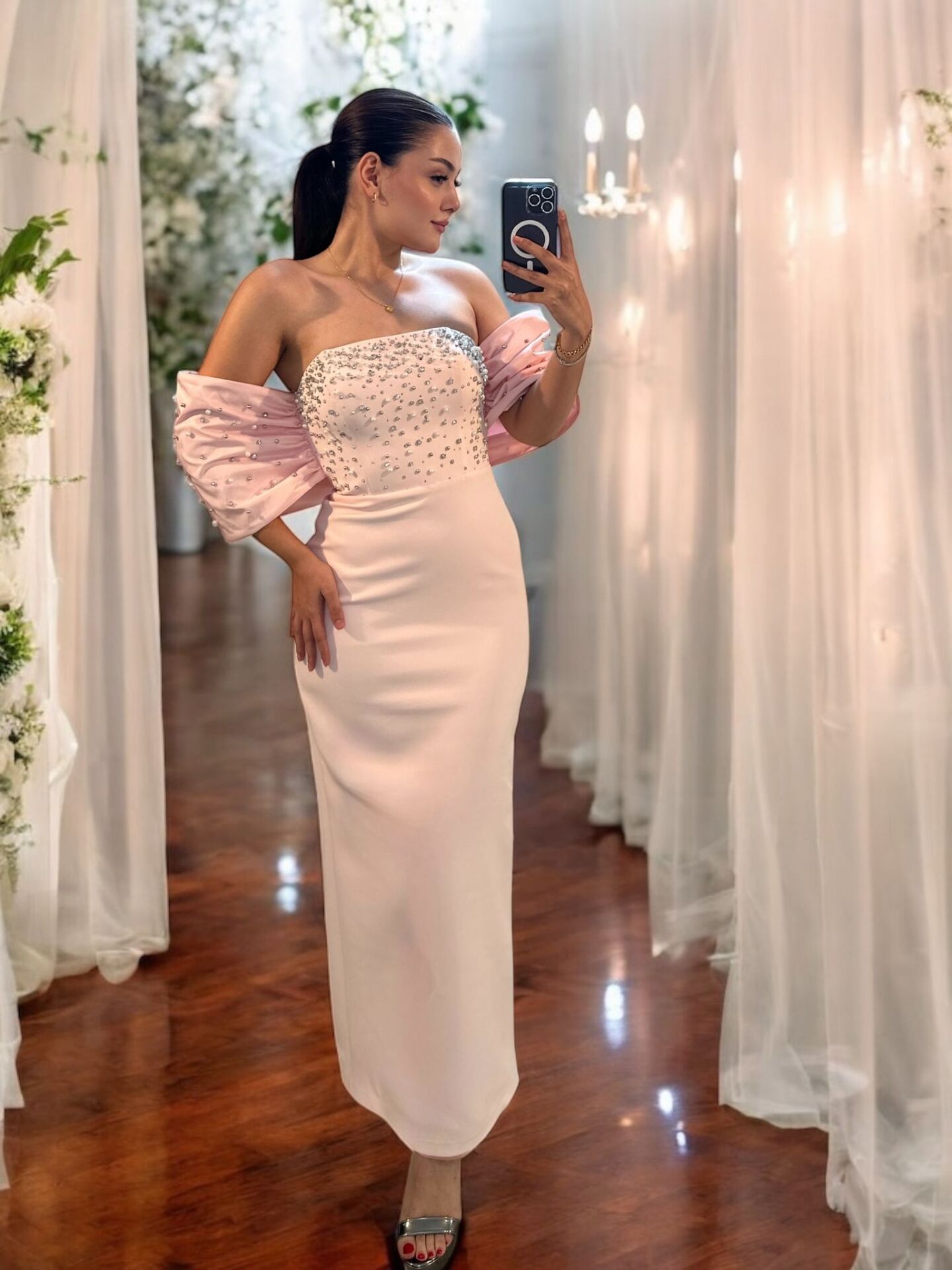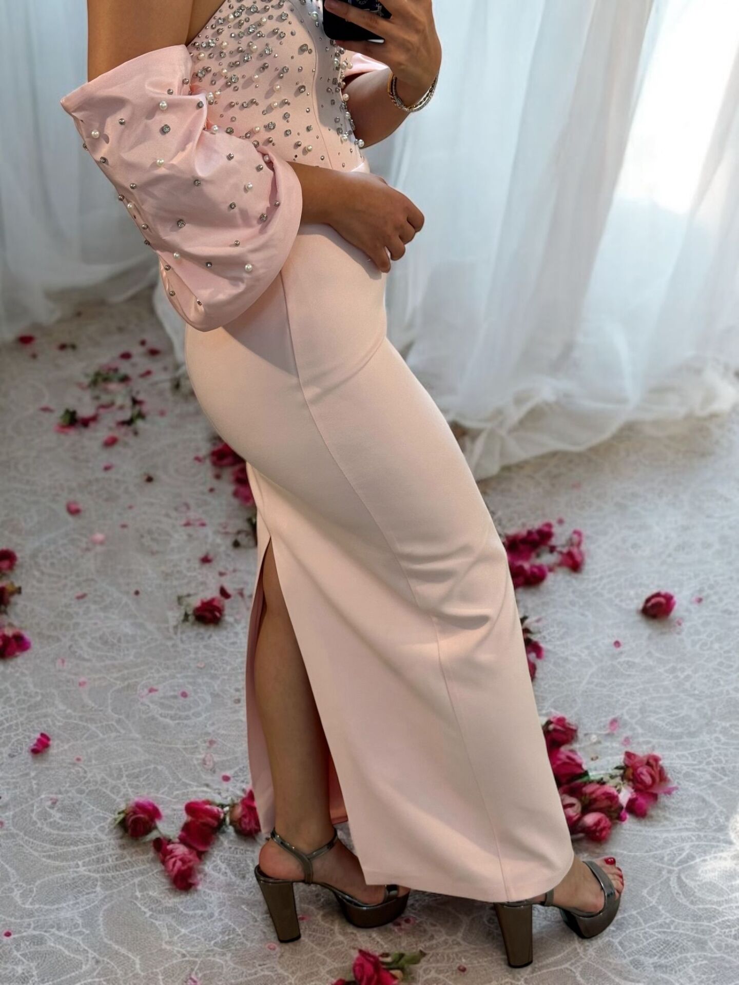 Zarif inci ve taş işlemeleriyle göz kamaştıran bilek boy abiye elbise kesimi, pudra pembesi rengi ve dikkat çekici tasarımı ile her gözü size çevirecek.