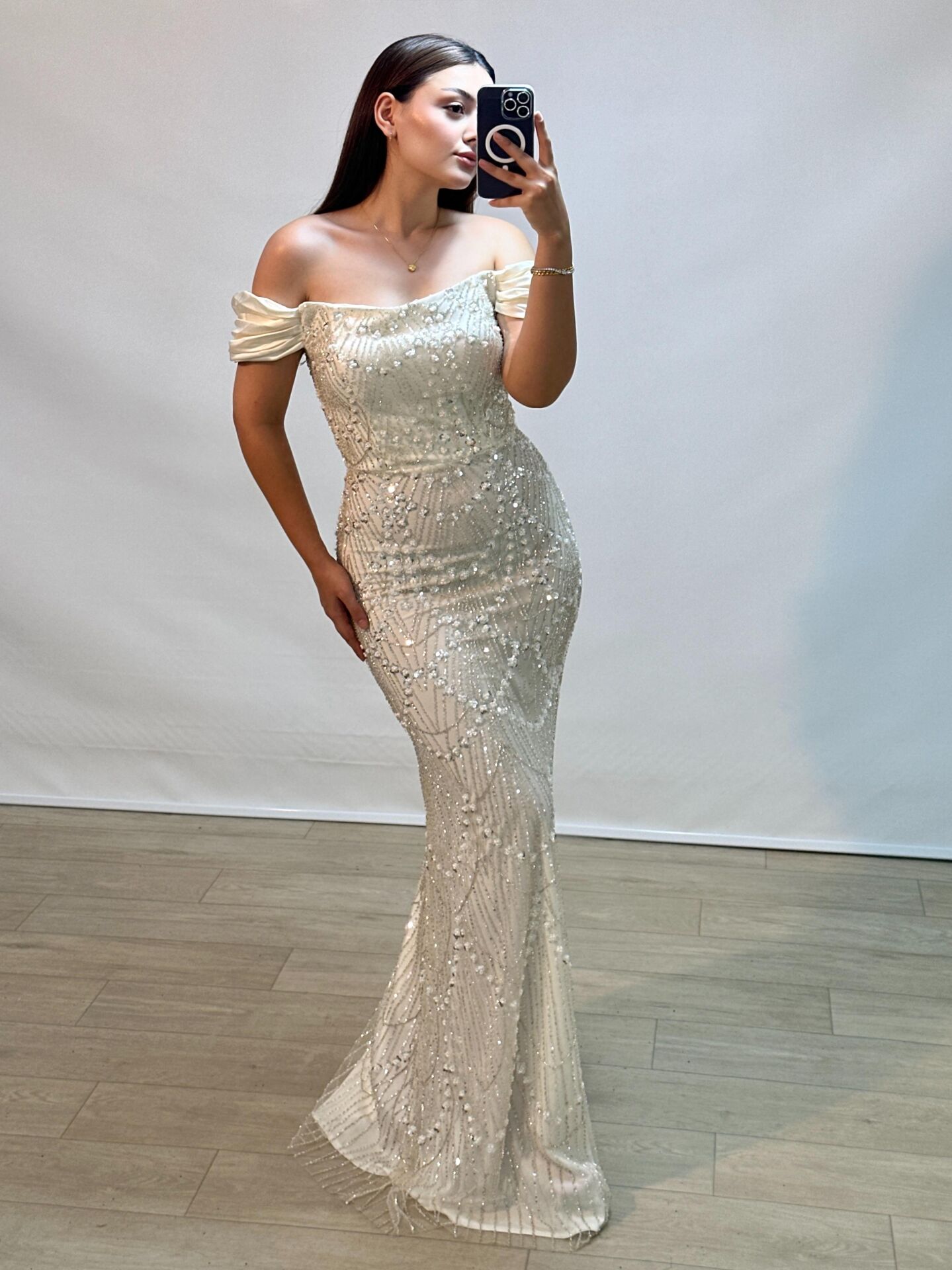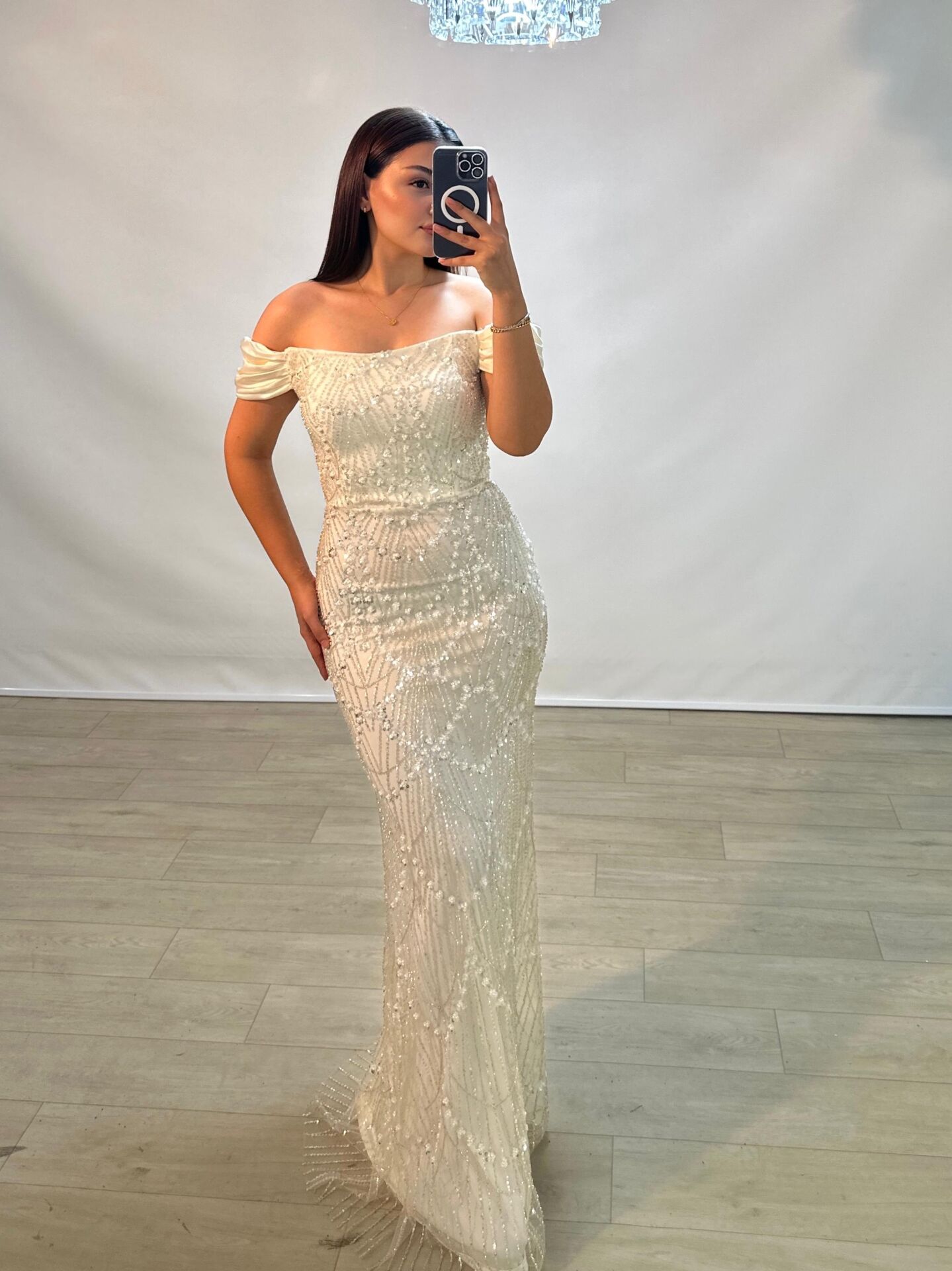 Divor Boncuk Ve Payet İşlemeli Saten Düşük Kollu Kırık Beyaz Abiye Elbise 38