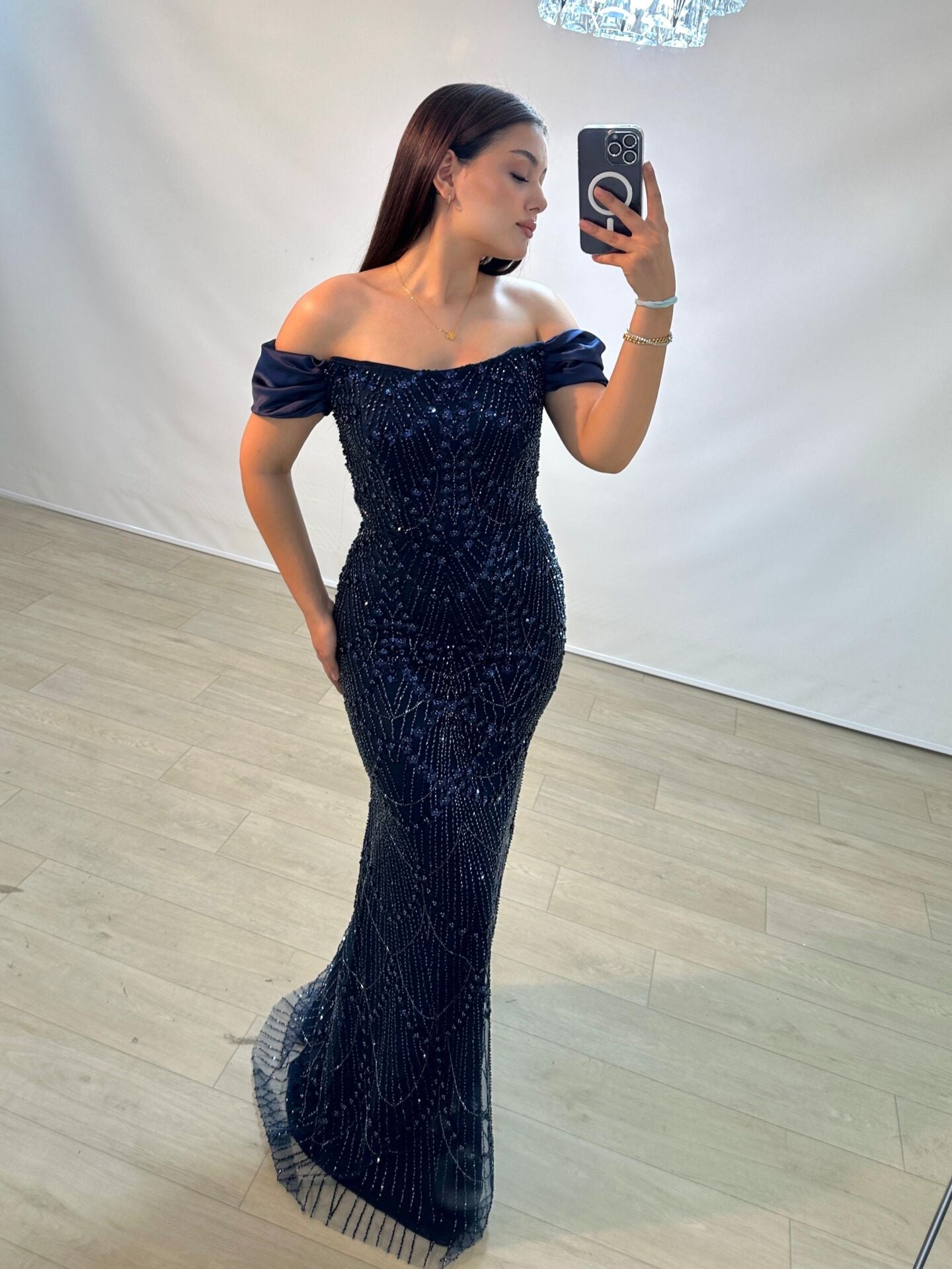 Divor Boncuk Ve Payet İşlemeli Saten Düşük Kollu Lacivert Abiye Elbise 36