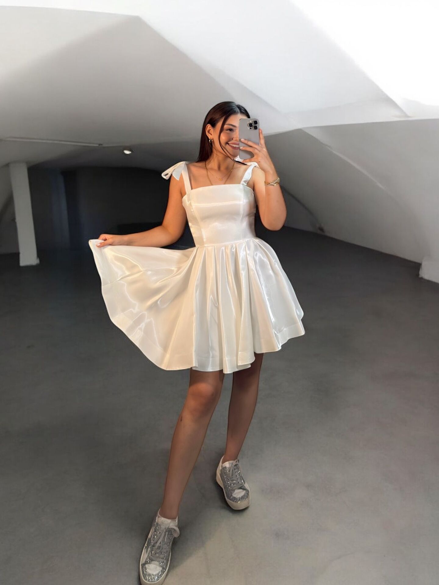 Candy Kısa Hologram Saten Beyaz Abiye Elbise