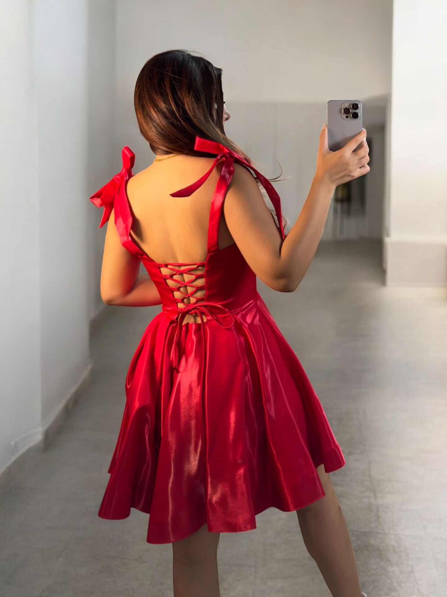 Candy Kısa Hologram Saten Kırmızı Abiye Elbise