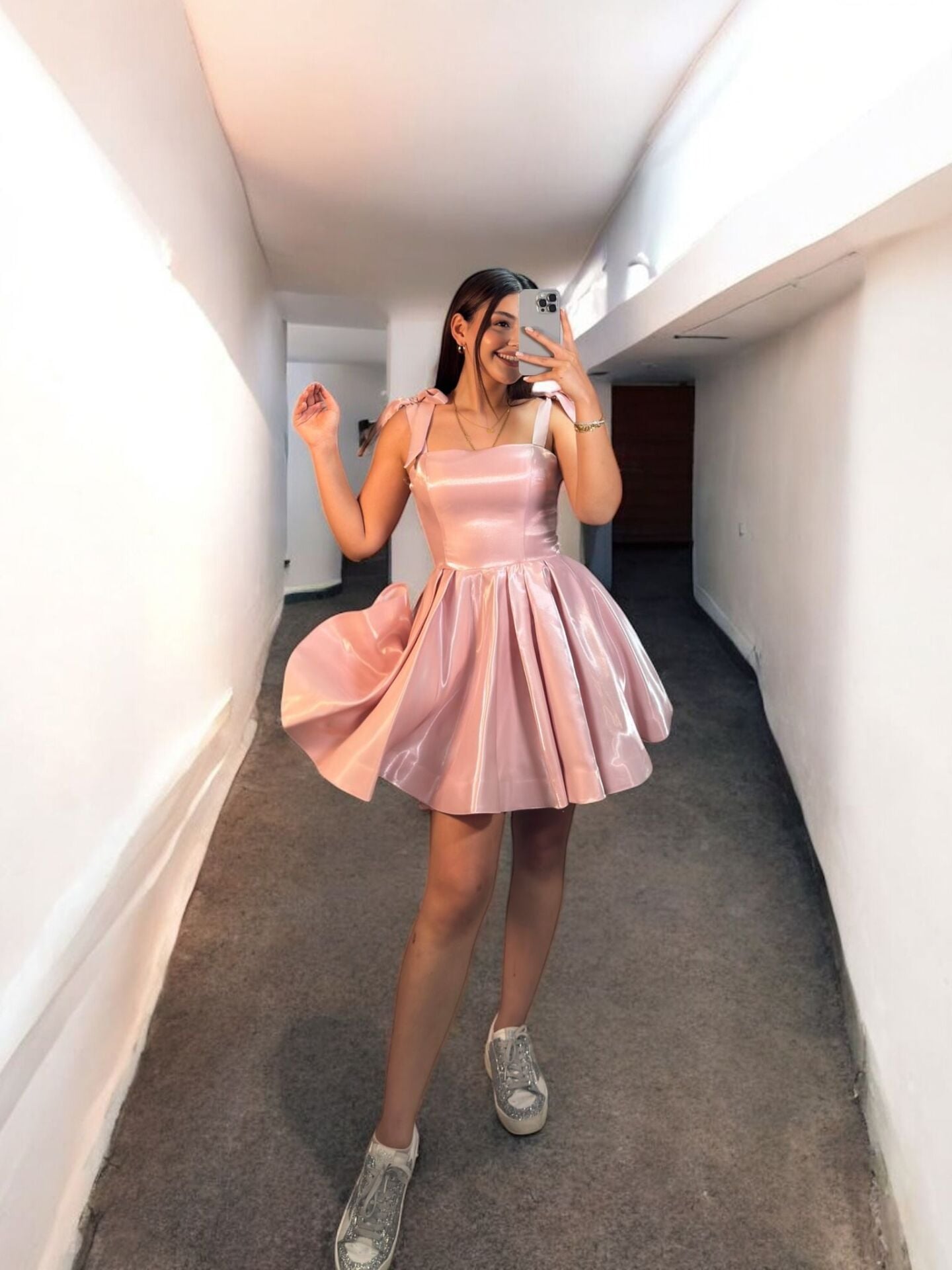 Candy Kısa Hologram Saten Pudra Pembe Abiye Elbise 38