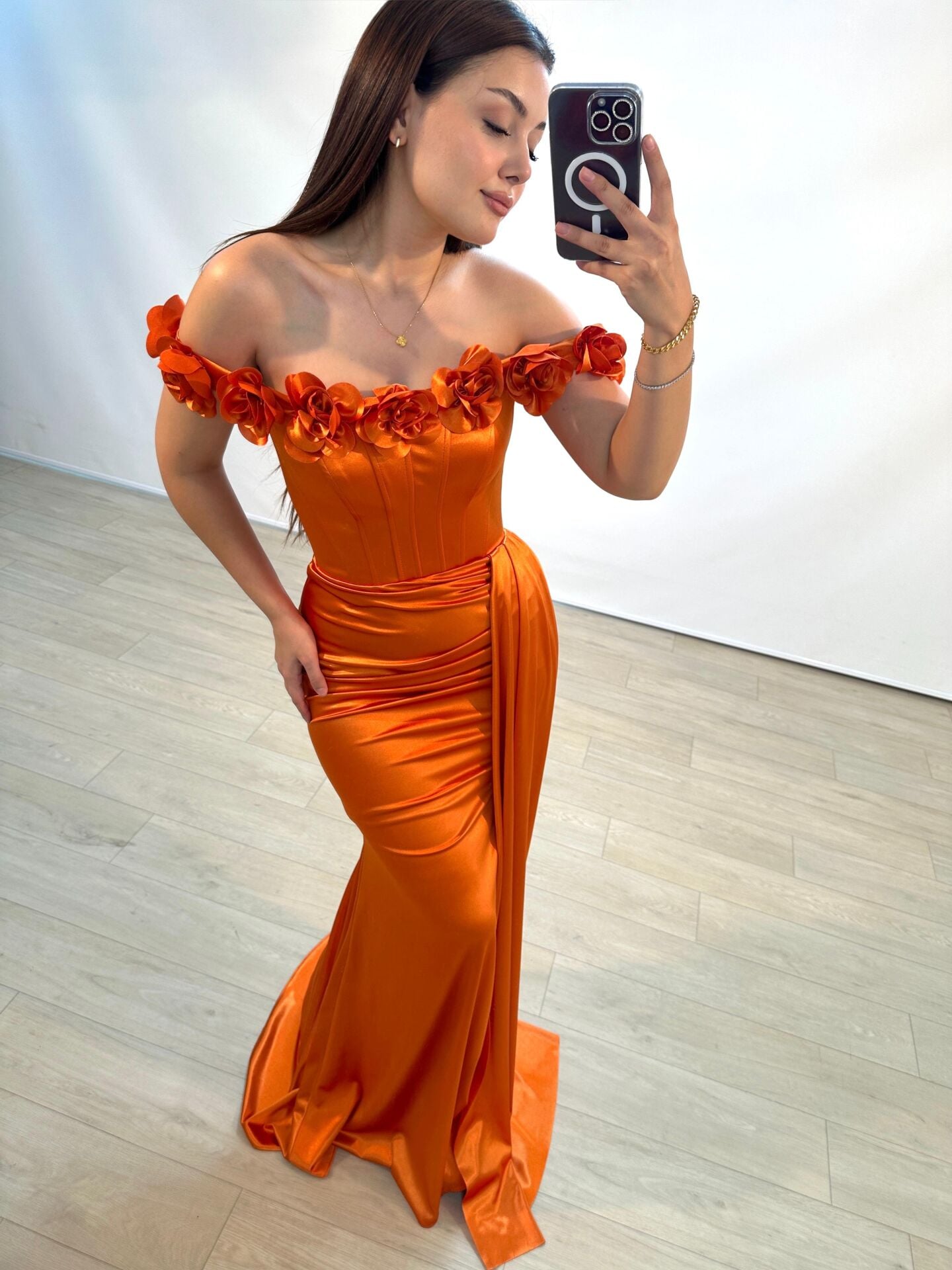 Daisy Çiçek Detaylı Saten Korseli Turuncu Renk Balık Model Abiye Elbise