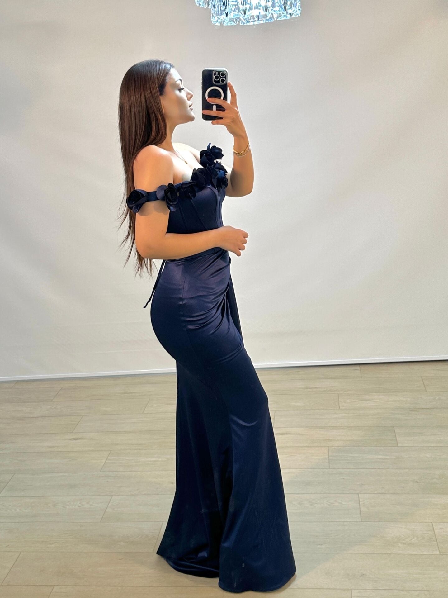 Daisy Çiçek Detaylı Saten Korseli Lacivert Balık Model Abiye Elbise