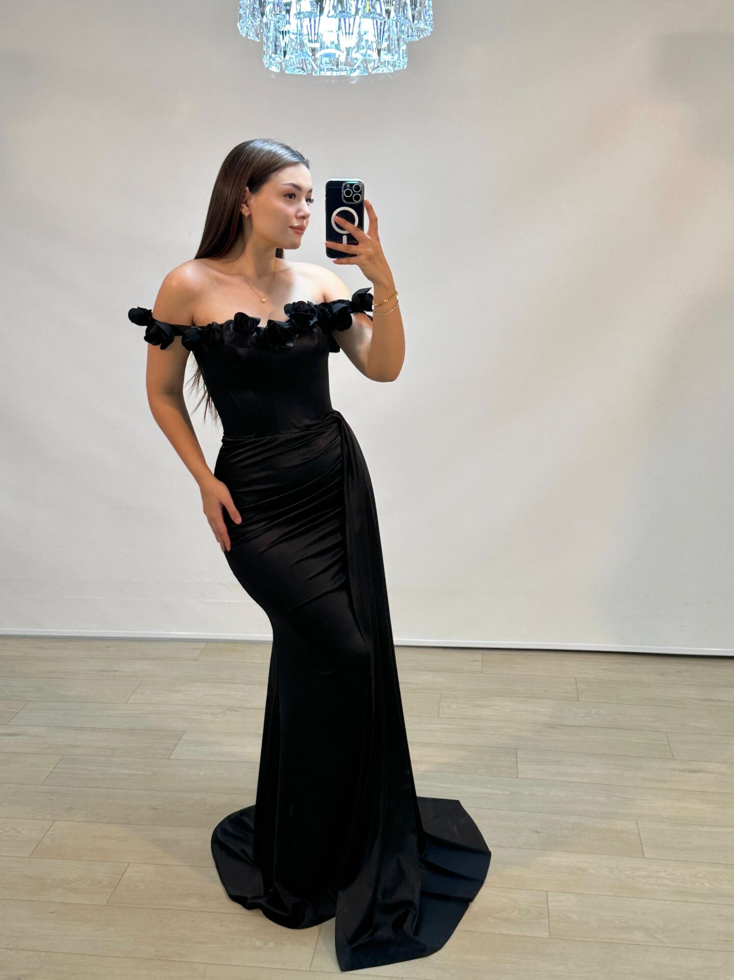 Daisy Çiçek Detaylı Saten Korseli Siyah Balık Model Abiye Elbise 38