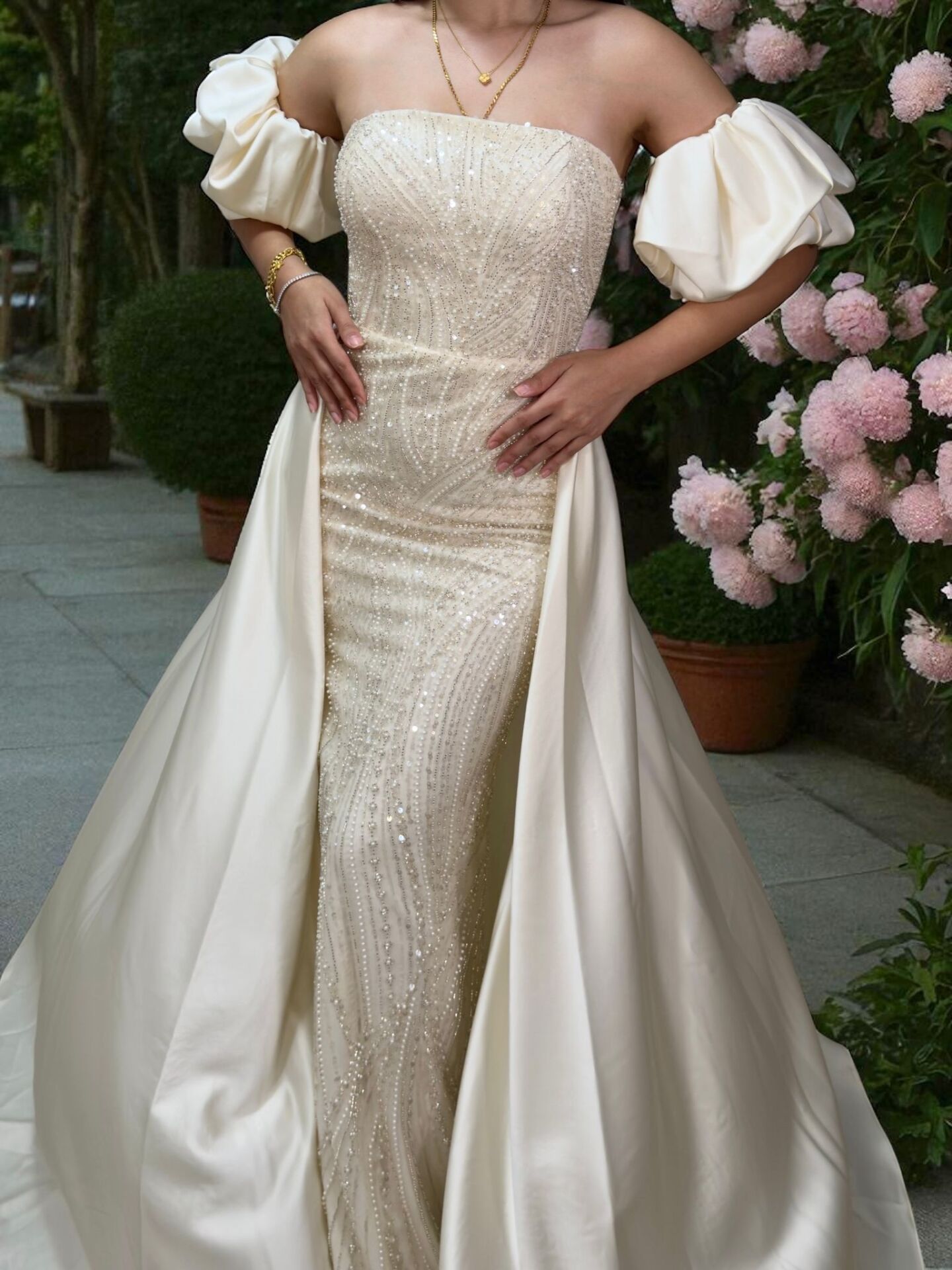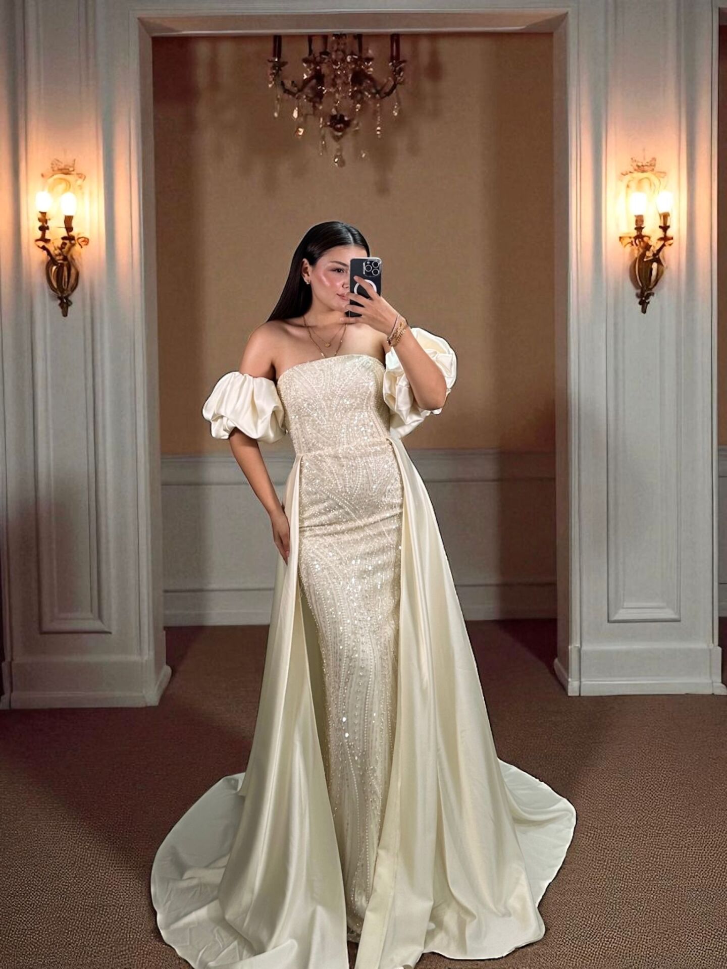 Bu özel tasarım abiye elbise,boncuk işlemesi ve pelerin detayıyla dikkat çekiyor. Full payet ve boncuk işlemeli balık kesim abiyeye bir de pelerin eklenince işte şahane tasarıyla diva elbisemiz .Saten kolları çıkarılıp takılabilir özelliği ile farklı bir şıklık sunuyor. Özel günlerinizde veya davetlerde şıklığınızı tamamlayacak bir seçenek.| Renk | : | Ekru |