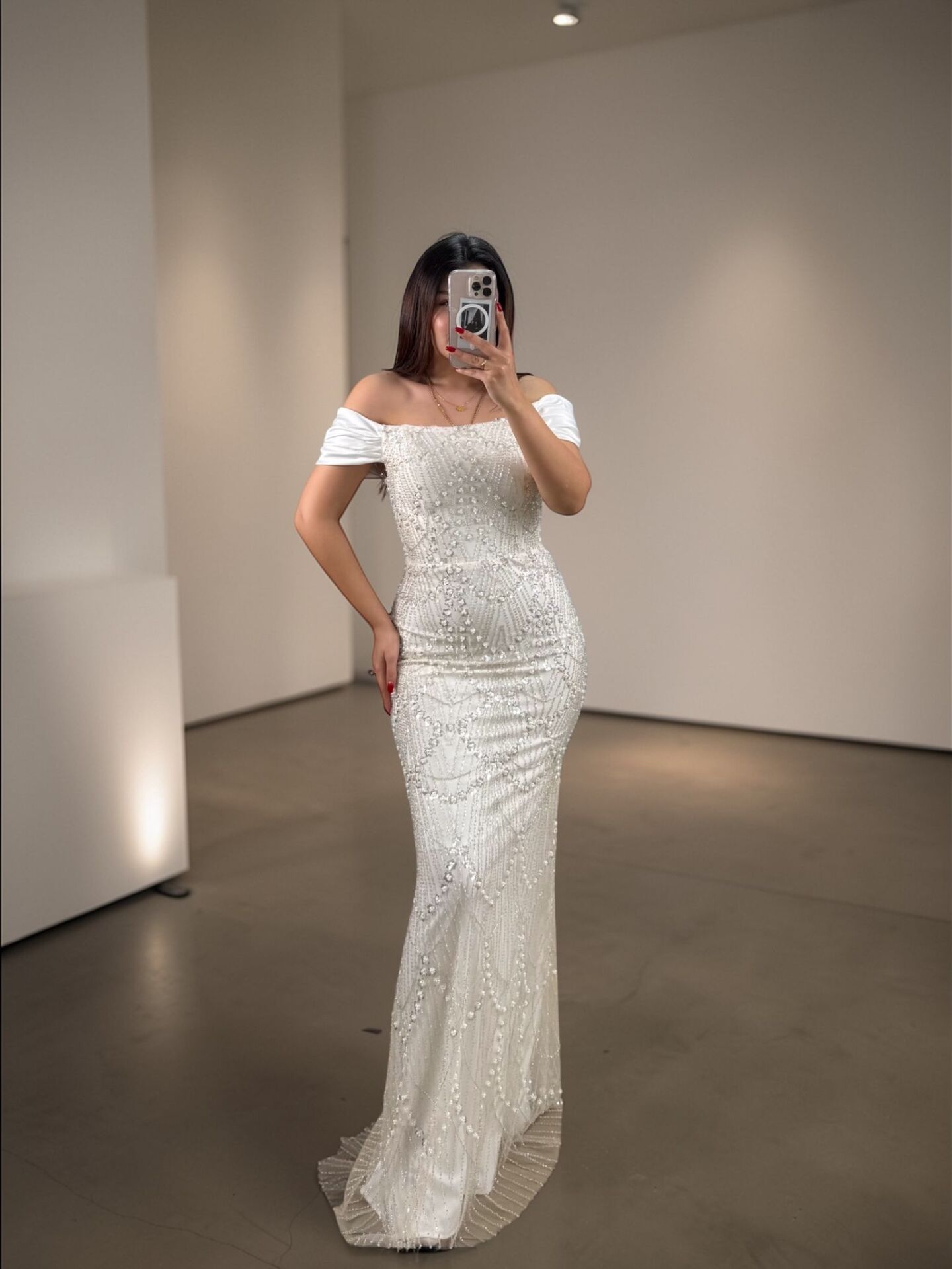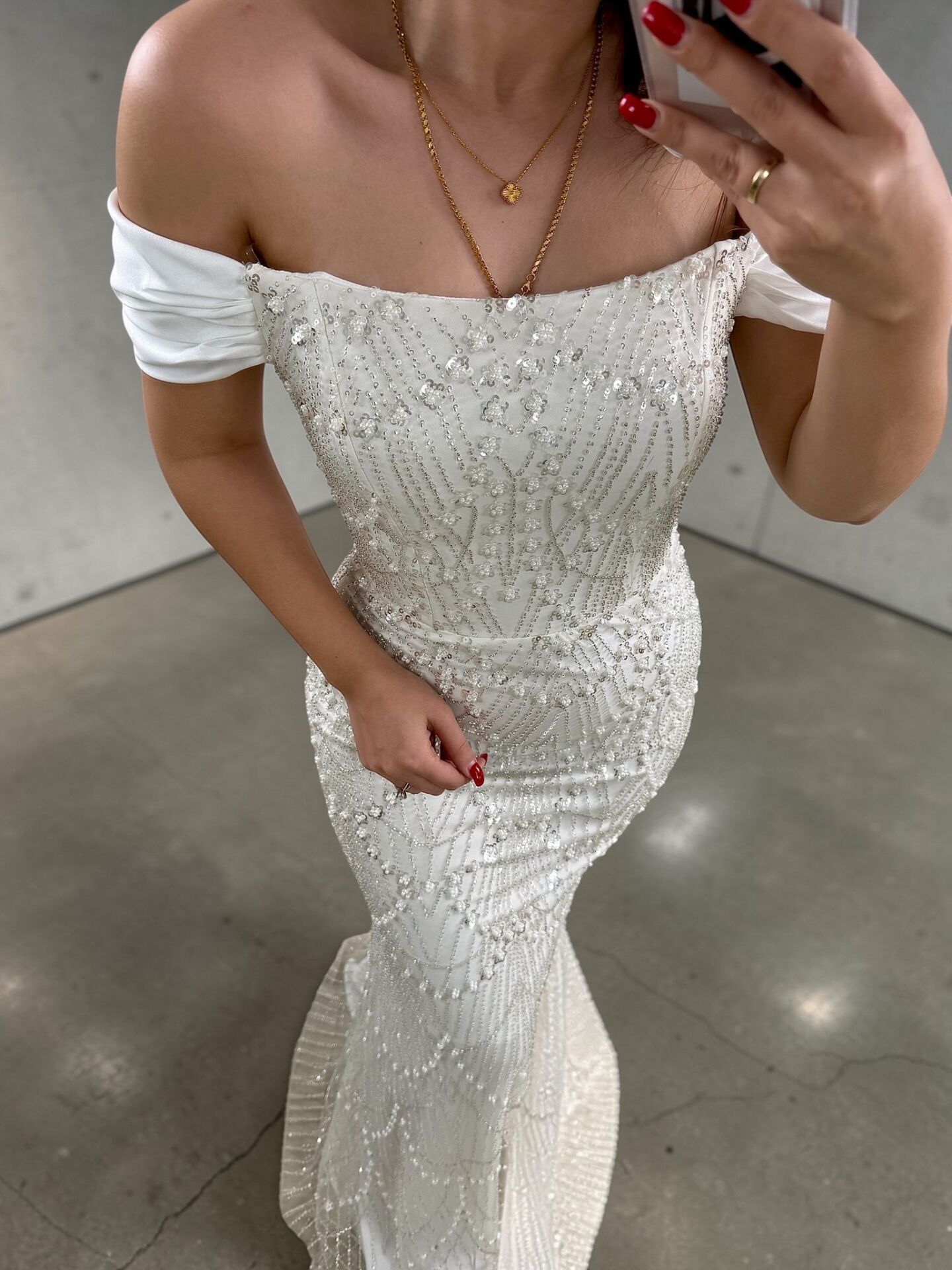 Divor Boncuk Ve Payet İşlemeli Düşük Kollu Kırık Beyaz Abiye Elbise 42