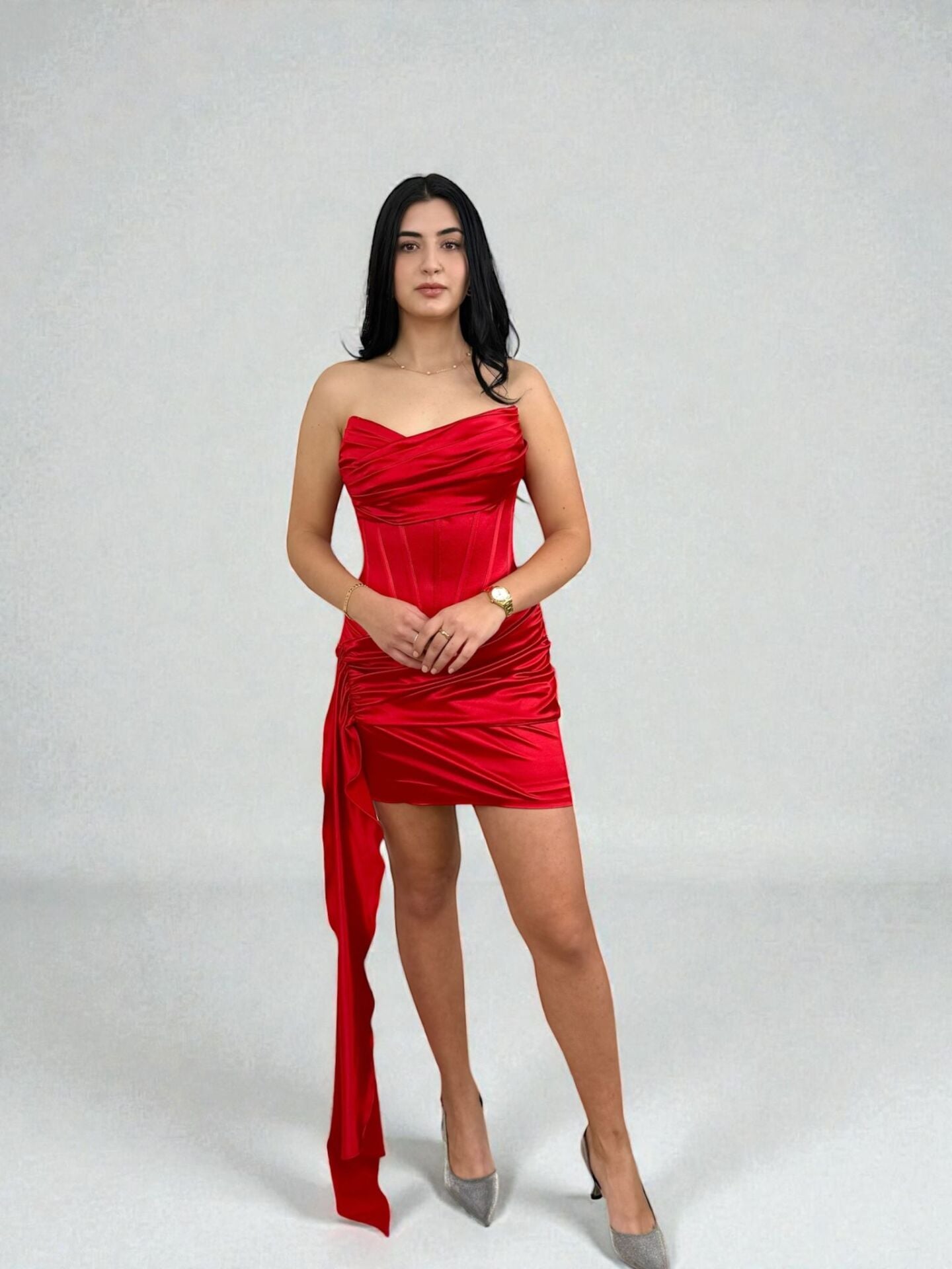 Göğsü drapeli ve beli korseli vücudu saran hariha bir elbise.