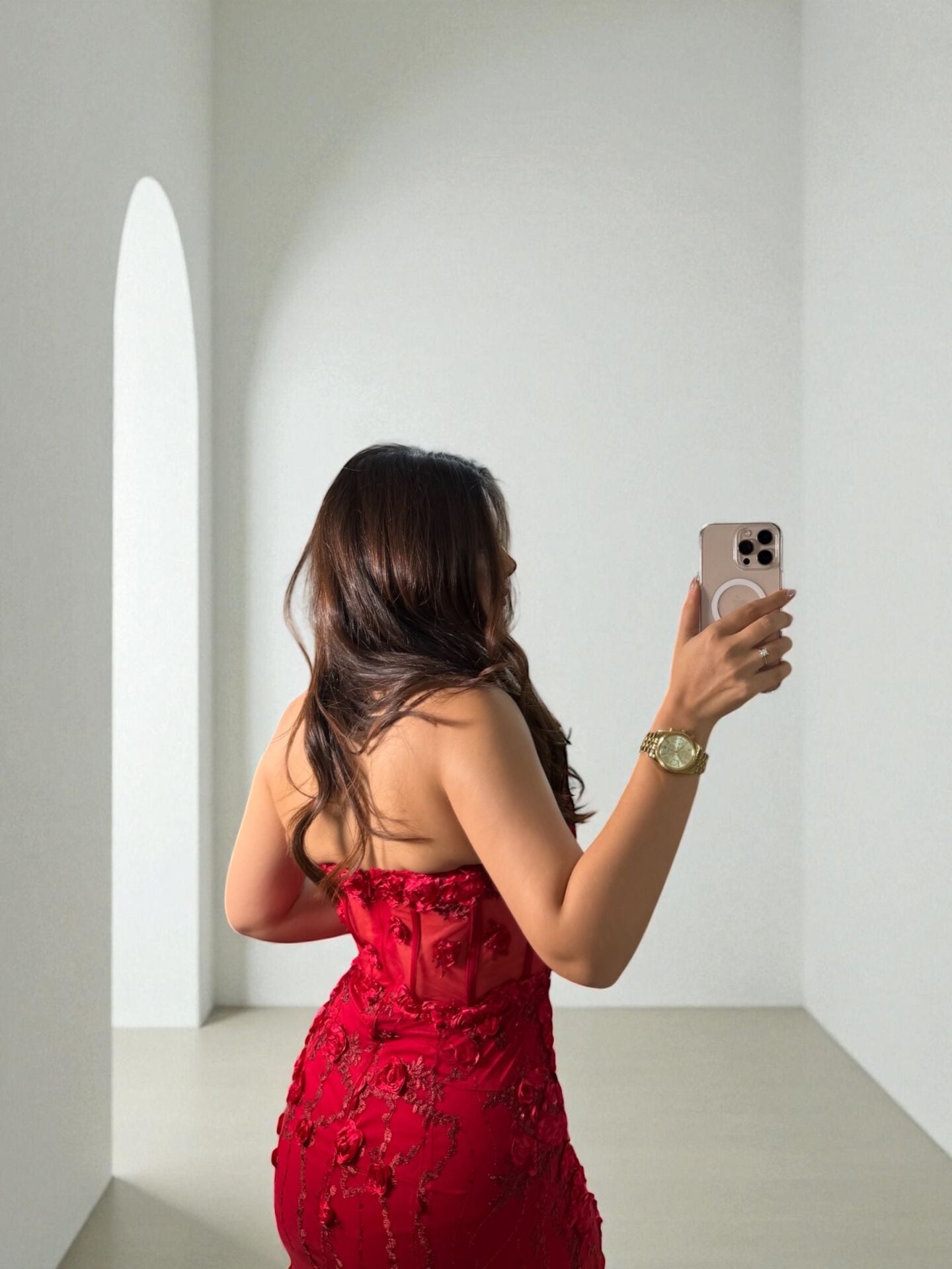 Flora Üç Boyutlu Çiçek İşlemeli Balık Kesim Kırmızı Abiye Elbise