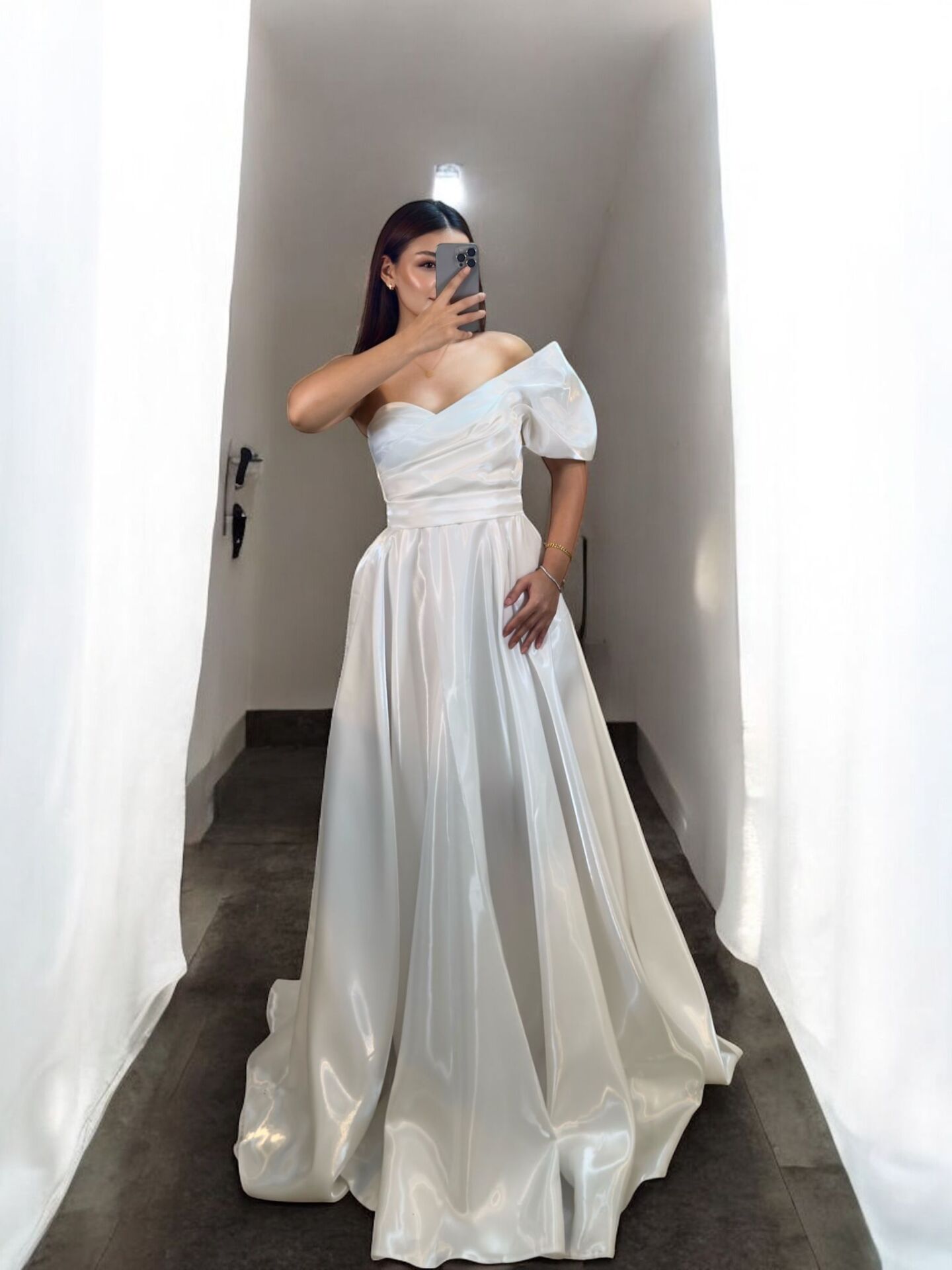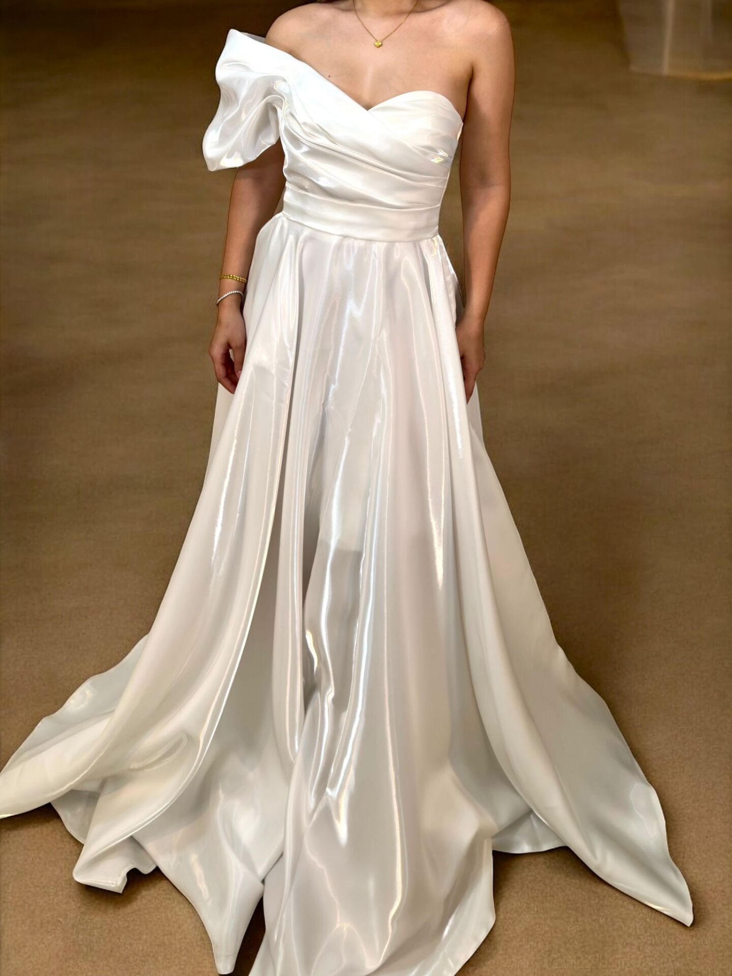 Galya Tek Kol Saten Parlak Beyaz Renk Abiye Elbise 36