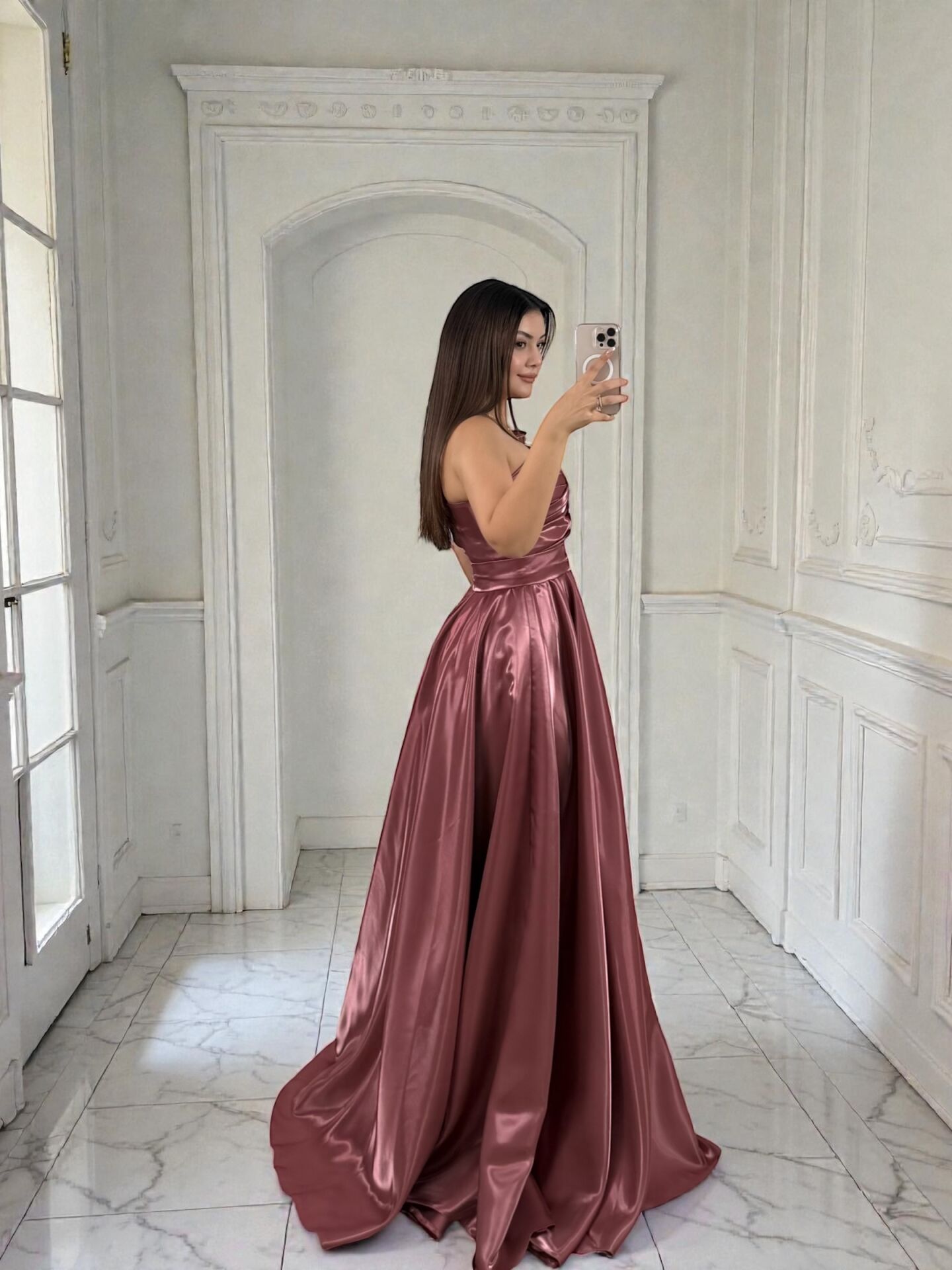 Bu parlak tok saten kumaşlı abiye elbise, şıklığı ve zarafeti bir araya getiriyor. Beli kemerli tasarımı sayesinde vücudu güzel bir şekilde vurgularken, parlak kumaşıyla dikkat çekici bir görünüm sunuyor. Davetlerde, düğünlerde ya da özel etkinliklerde rahatlıkla tercih edebileceğiniz bu elbise, size zarif ve göz alıcı bir görünüm kazandıracak.