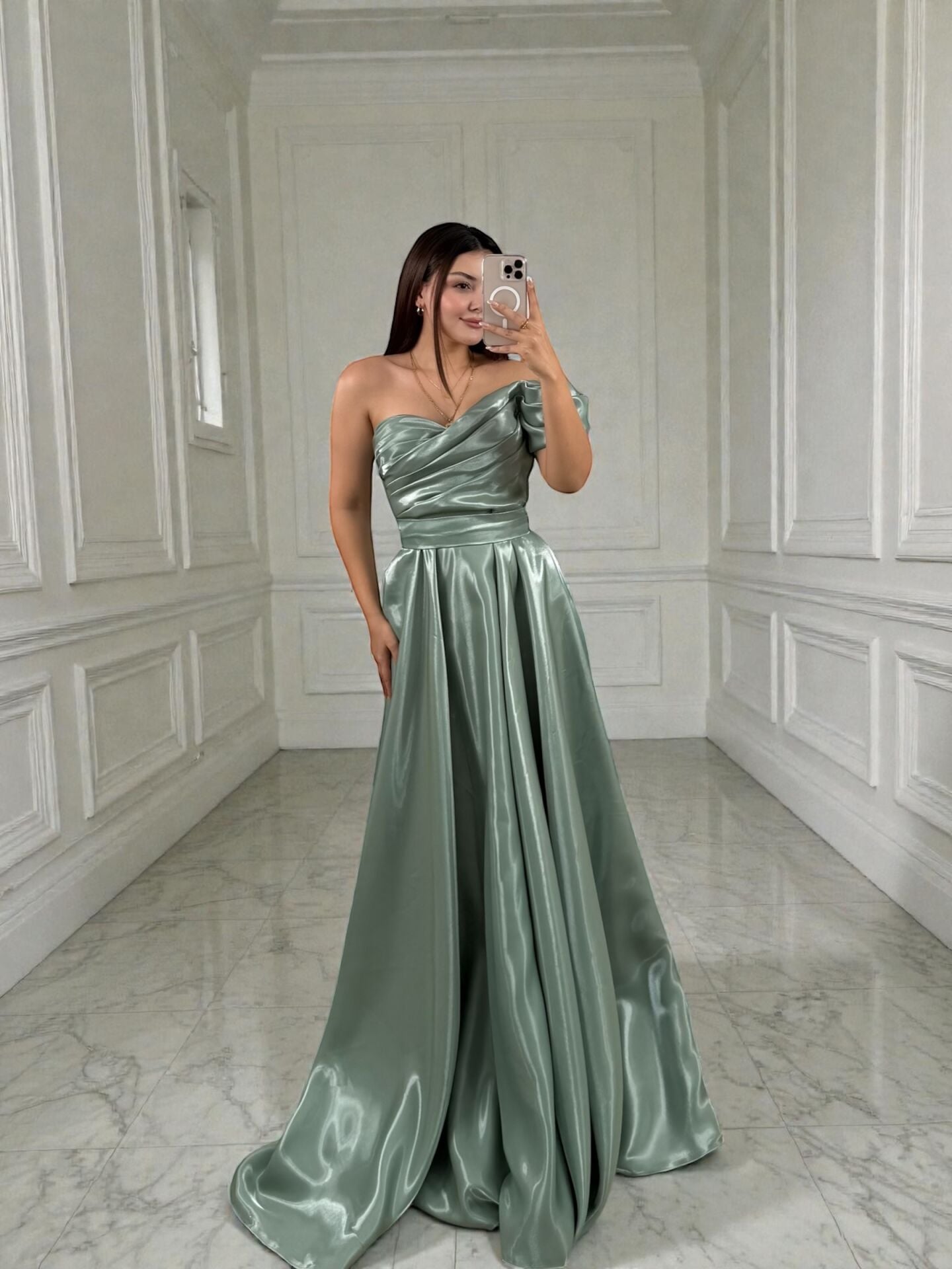Galya Tek Kol Saten Parlak Mint Yeşili Abiye Elbise 42