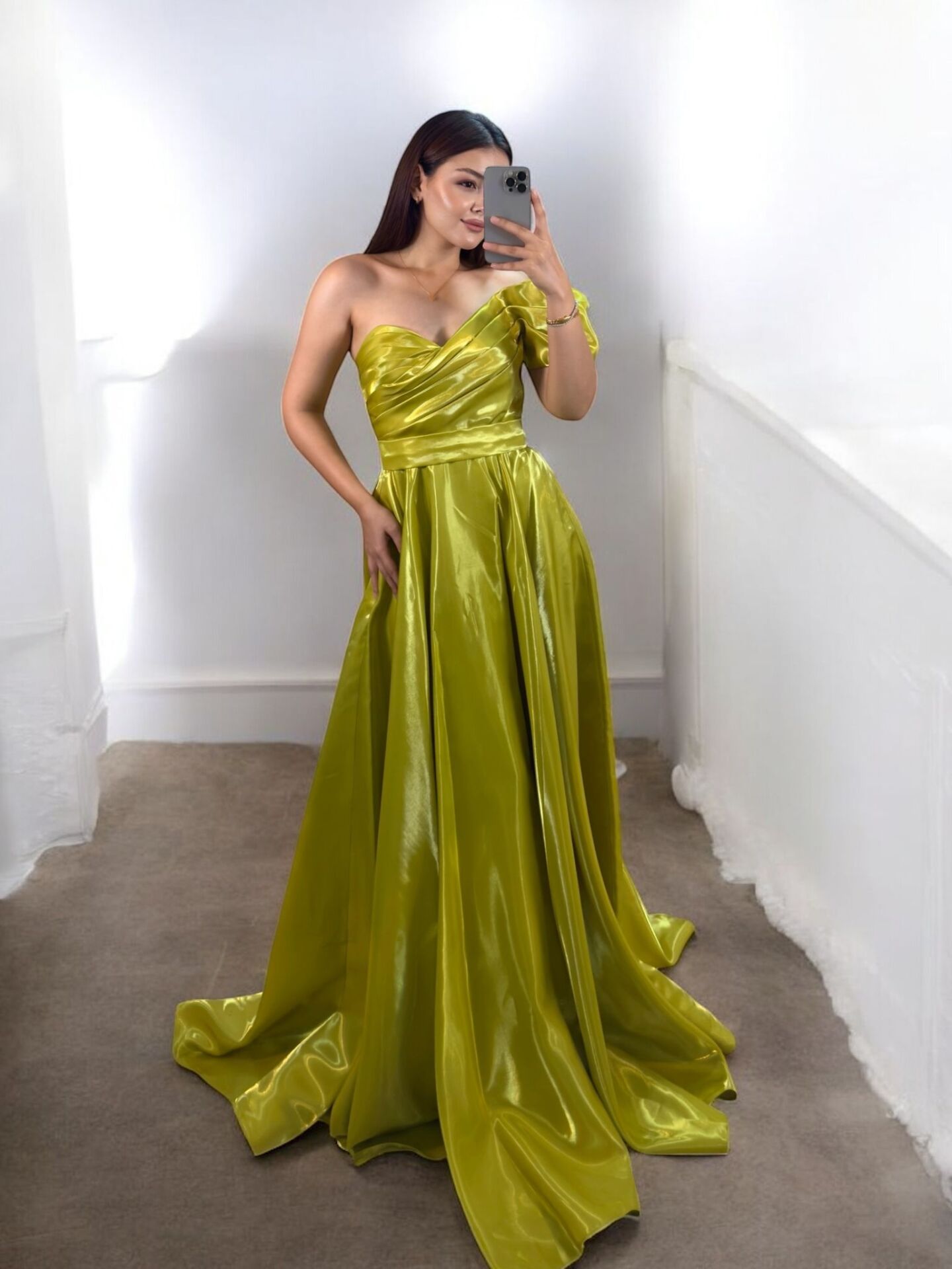 Galya Tek Kol Saten Parlak Zeytin Yeşili Abiye Elbise 36