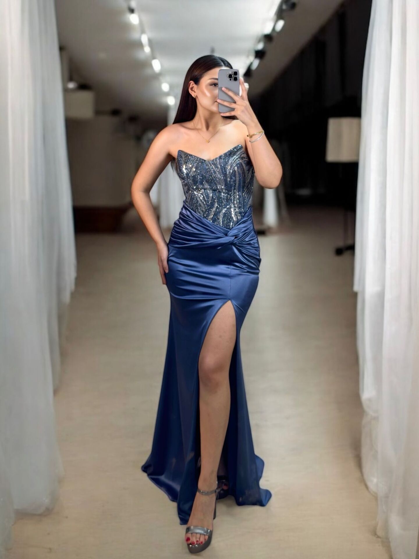 Safir Göğsü Payet İşlemeli Beli Düğüm Detaylı İndigo Renk Saten Abiye Elbise 46