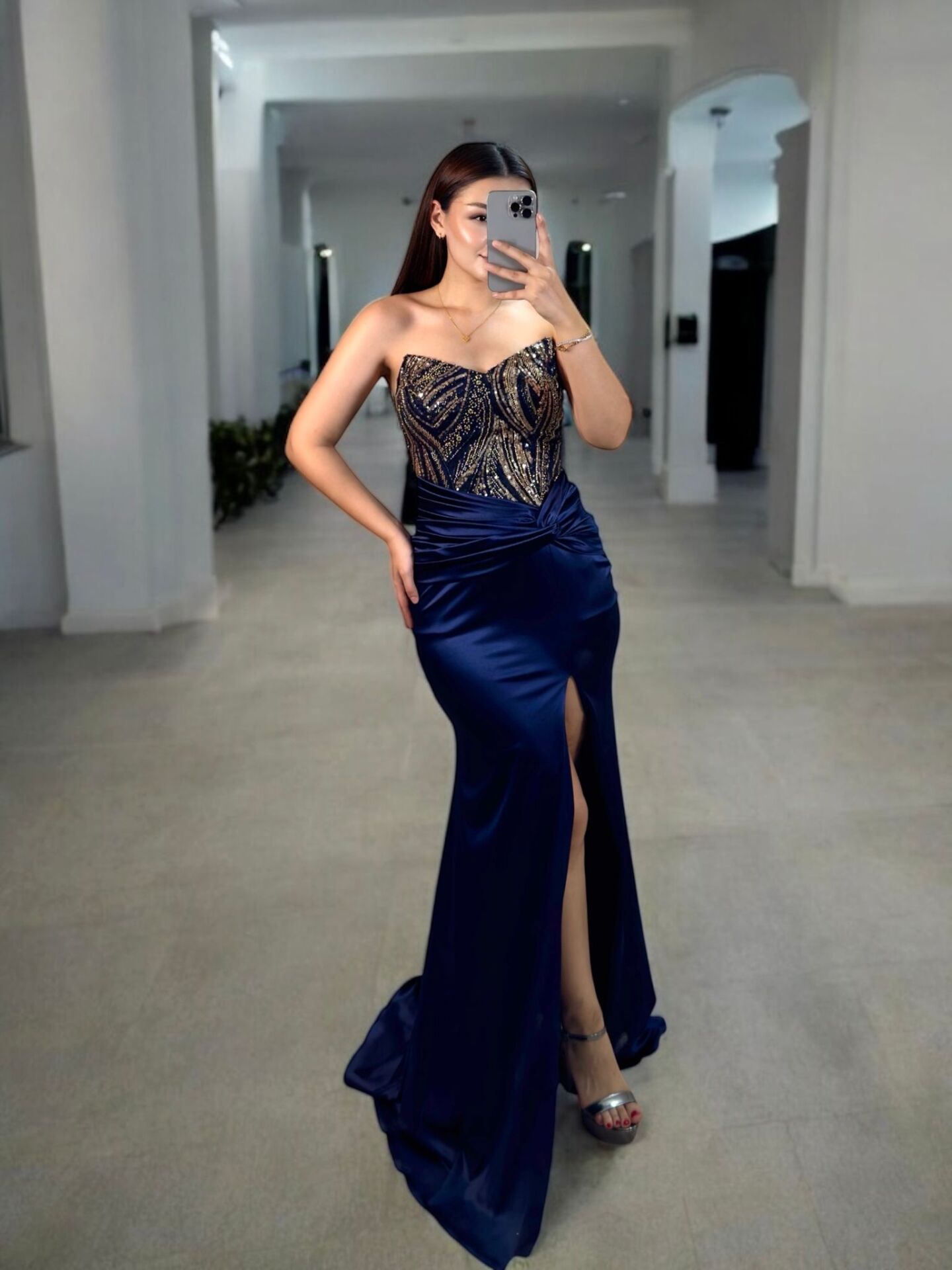 Safir Göğsü Payet İşlemeli Beli Düğüm Detaylı Lacivert Renk Saten Abiye Elbise