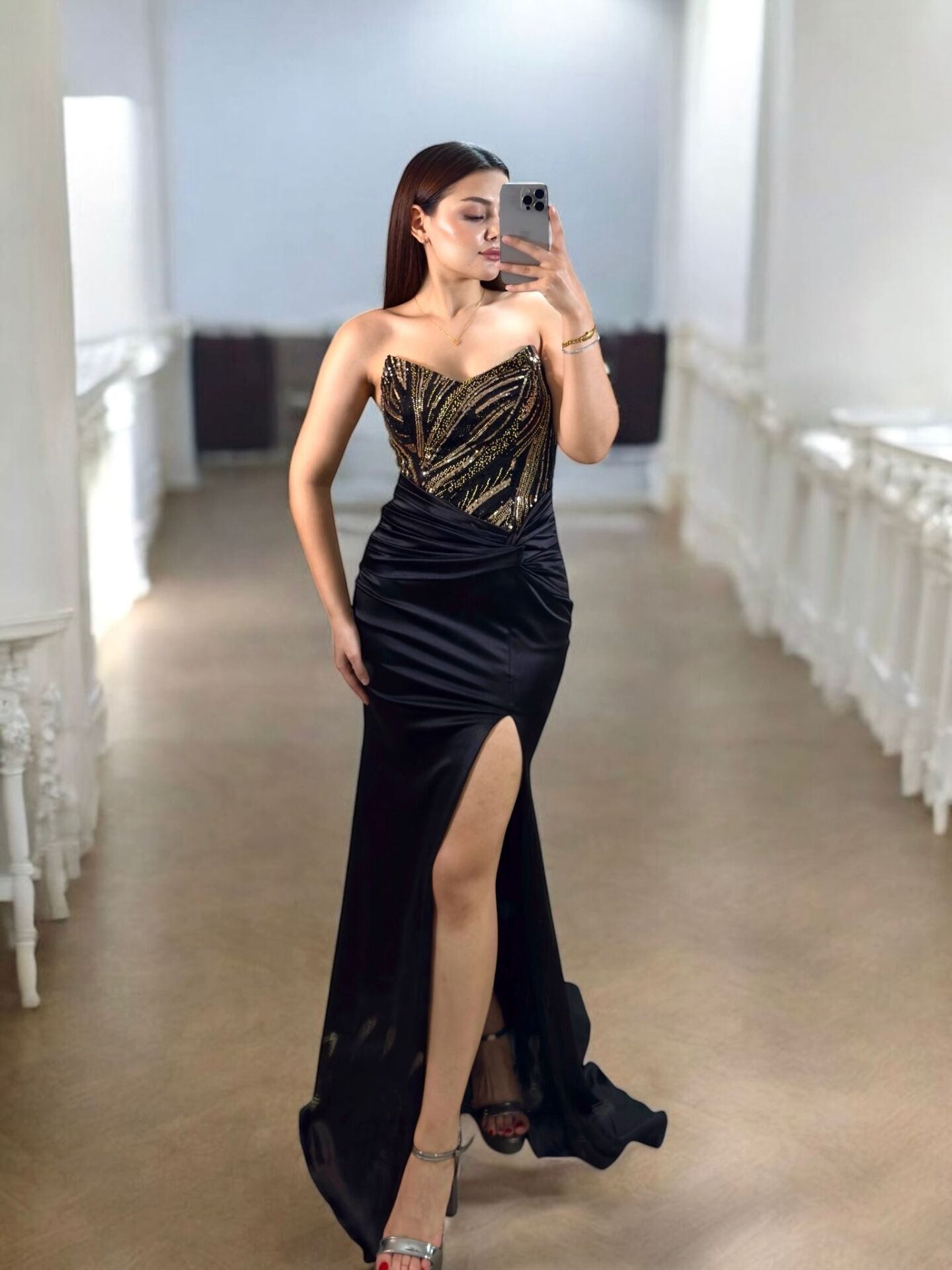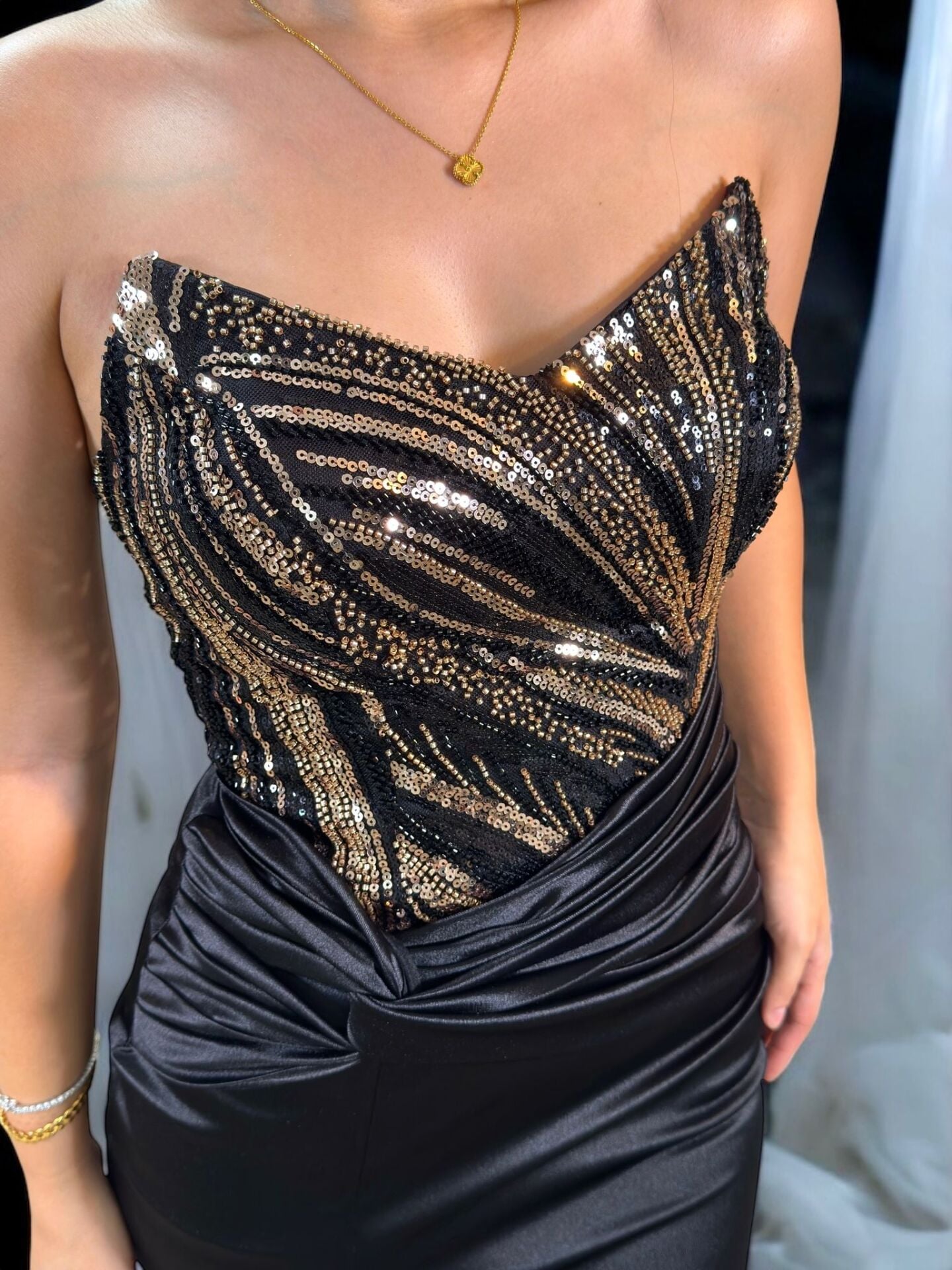 Safir Göğsü Payet İşlemeli Beli Düğüm Detaylı Siyah Renk Saten Abiye Elbise 50