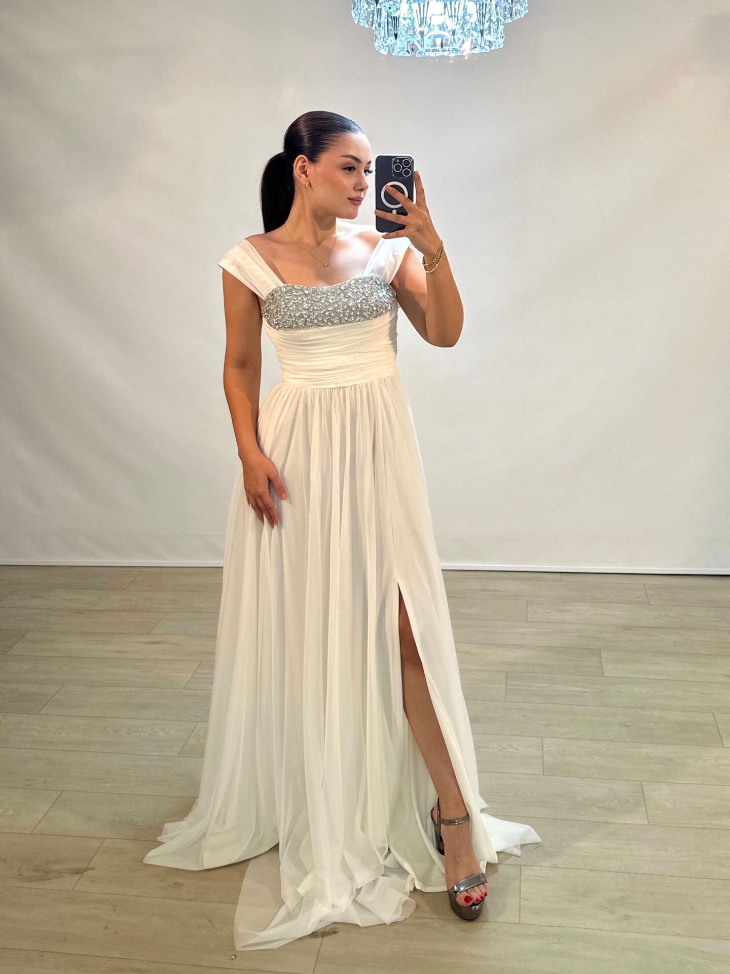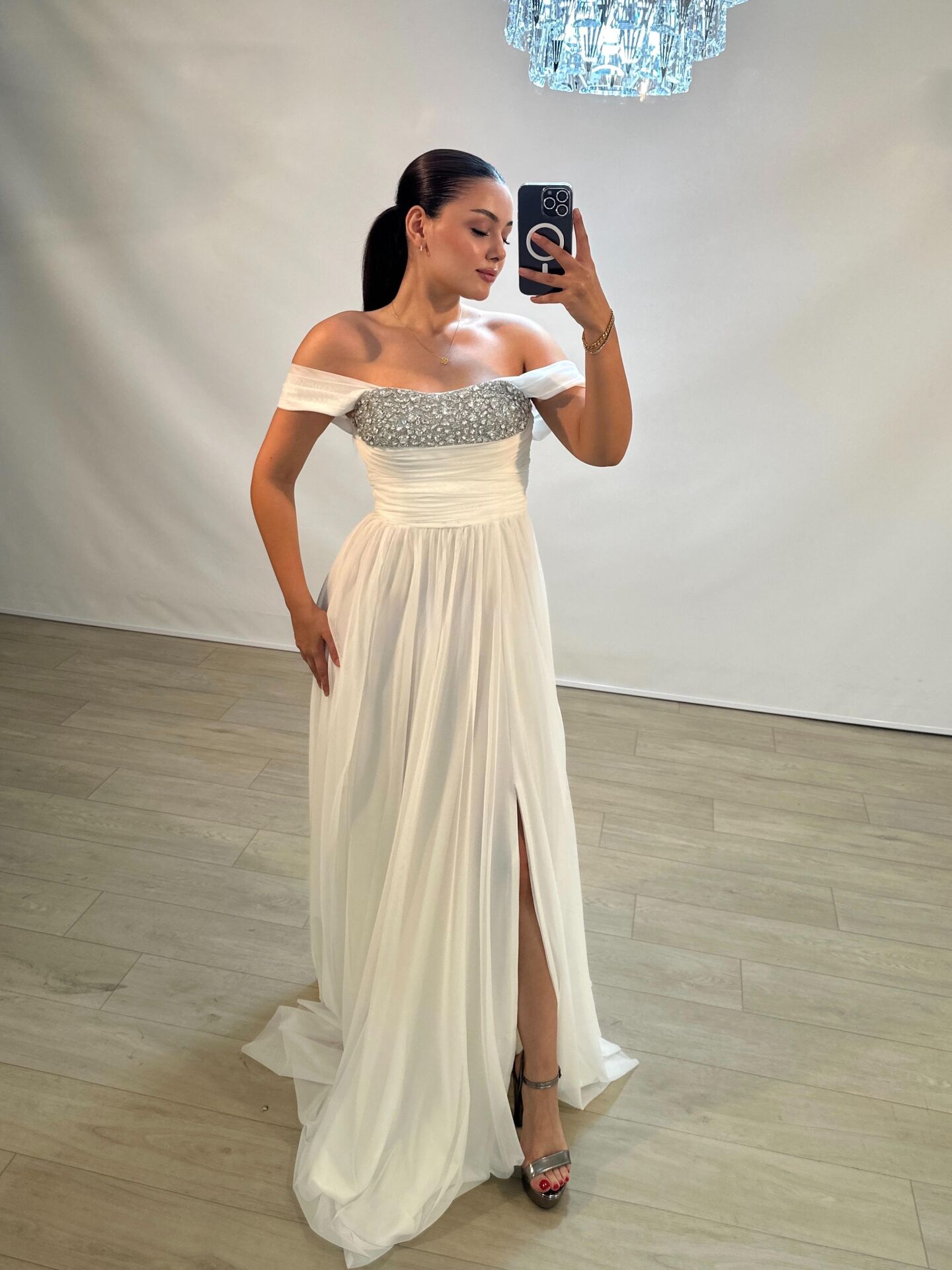 Glorya Göğsü Taş İşlemeli Şifon Kumaşlı Yırtmaçlı Beyaz Abiye Elbise
