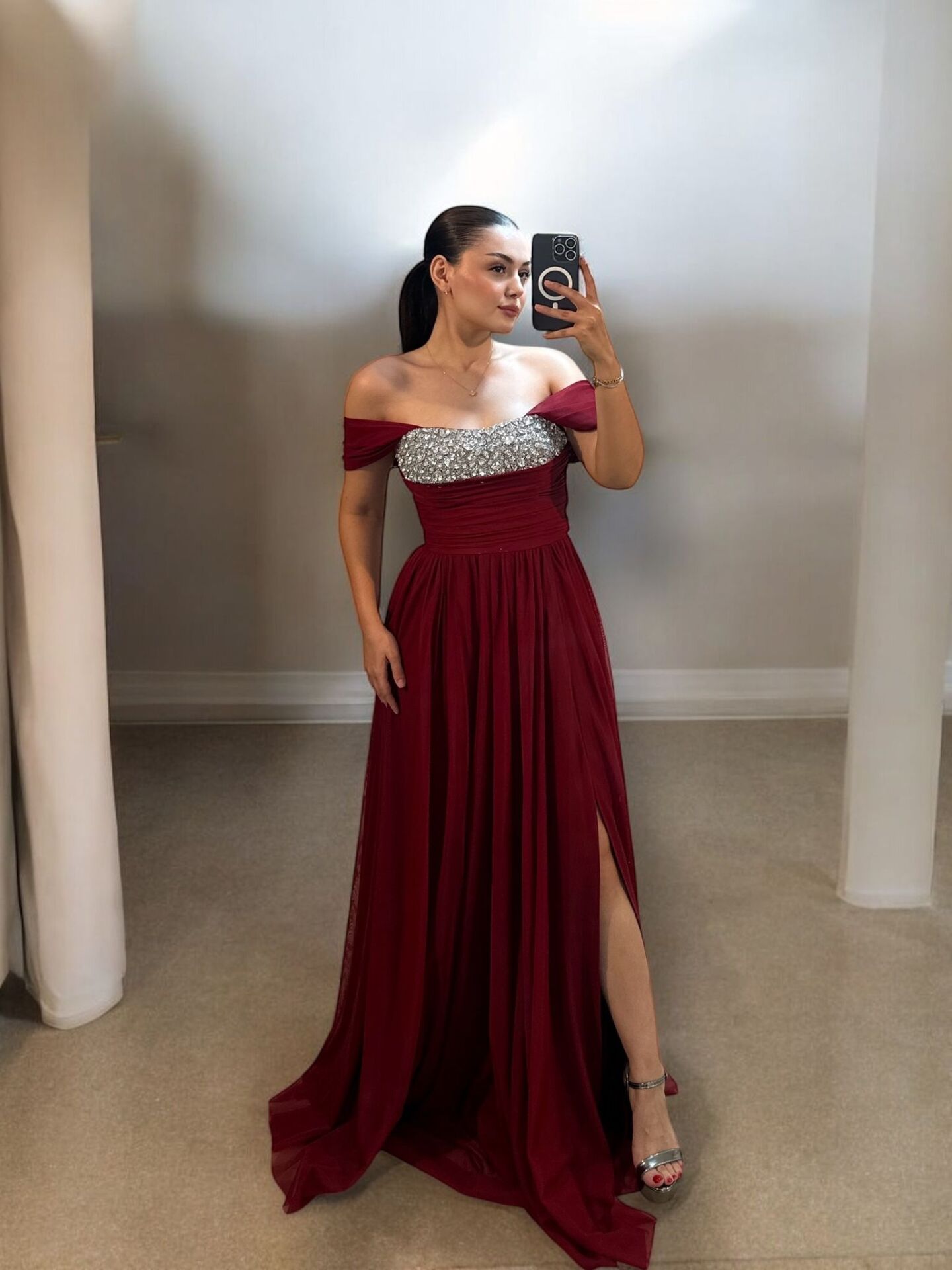 Glorya Göğsü Taş İşlemeli Şifon Kumaşlı Yırtmaçlı Bordo Abiye Elbise