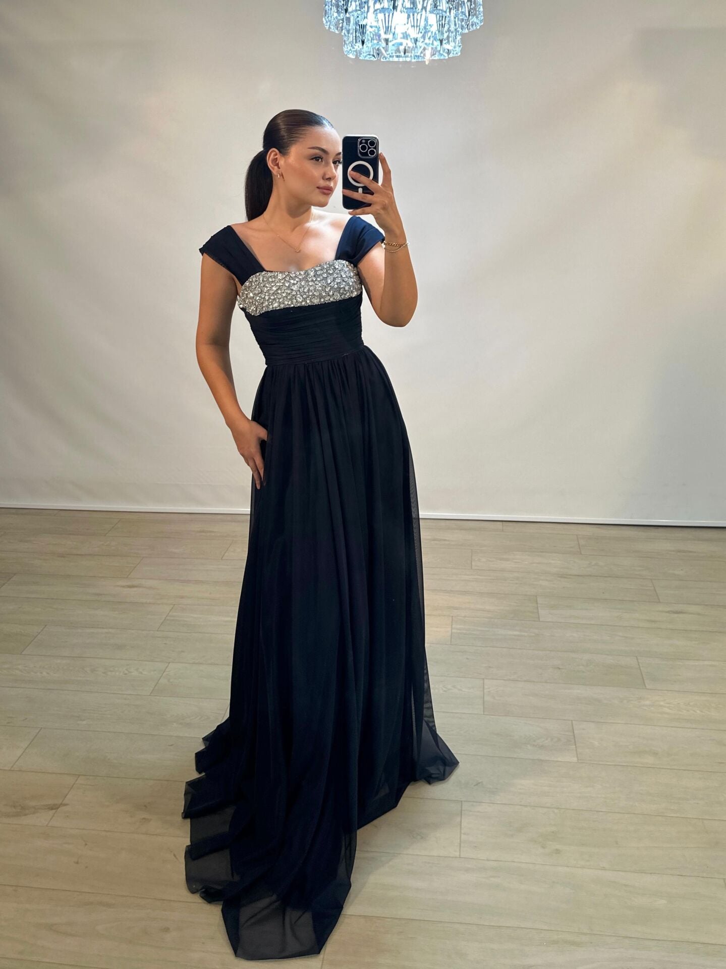 Glorya Göğsü Taş İşlemeli Şifon Kumaşlı Yırtmaçlı Lacivert Abiye Elbise 36