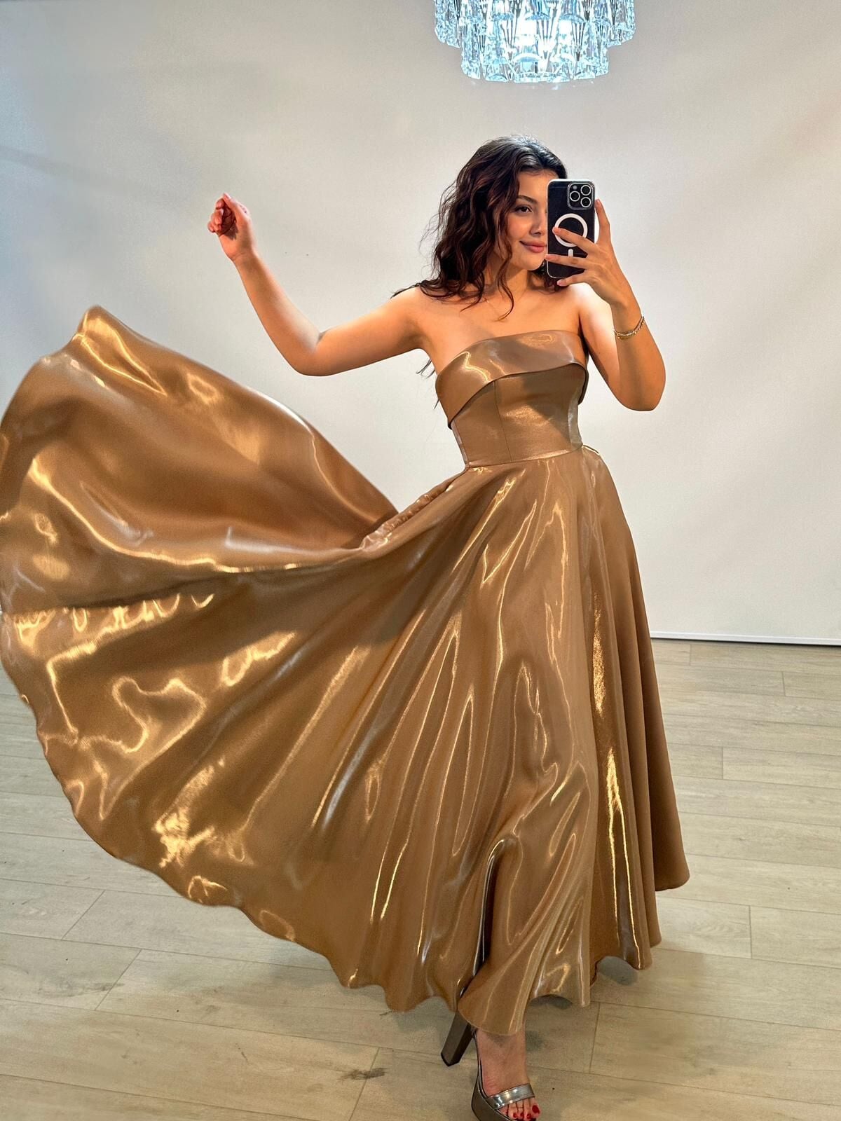 Stella Hologram Saten Straplez Bilek Boy Vizon Renk Abiye Elbise