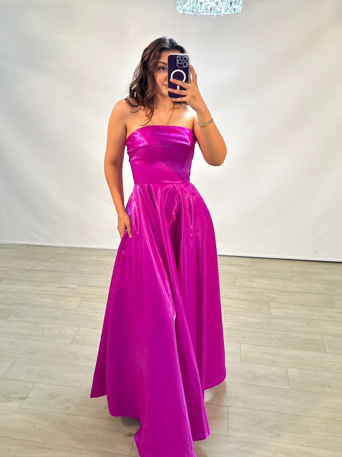 Stella Hologram Saten Straplez Fuşya Renk Abiye Elbise 36