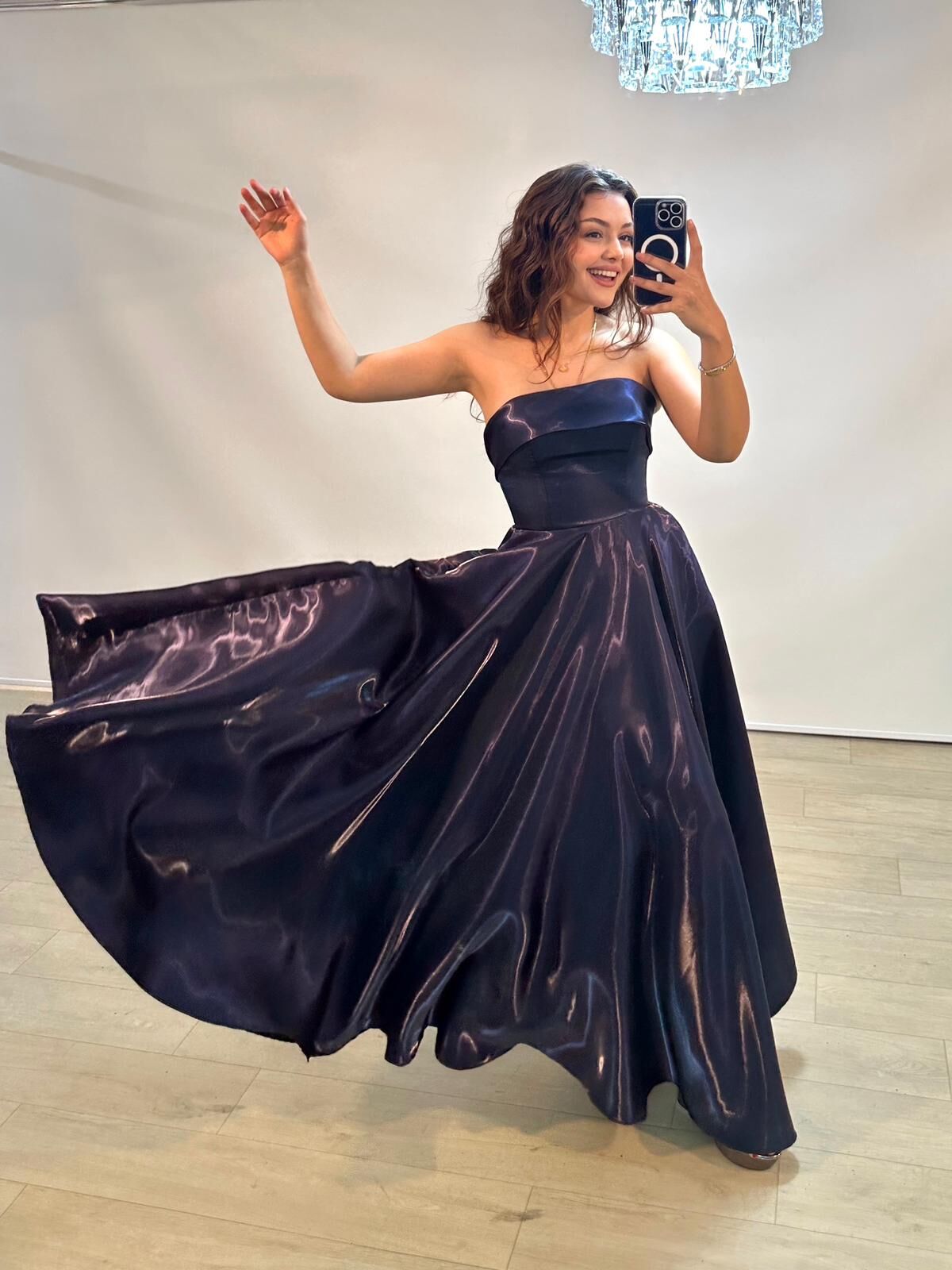 Stella Hologram Saten Straplez Lacivert Renk Abiye Elbise 36