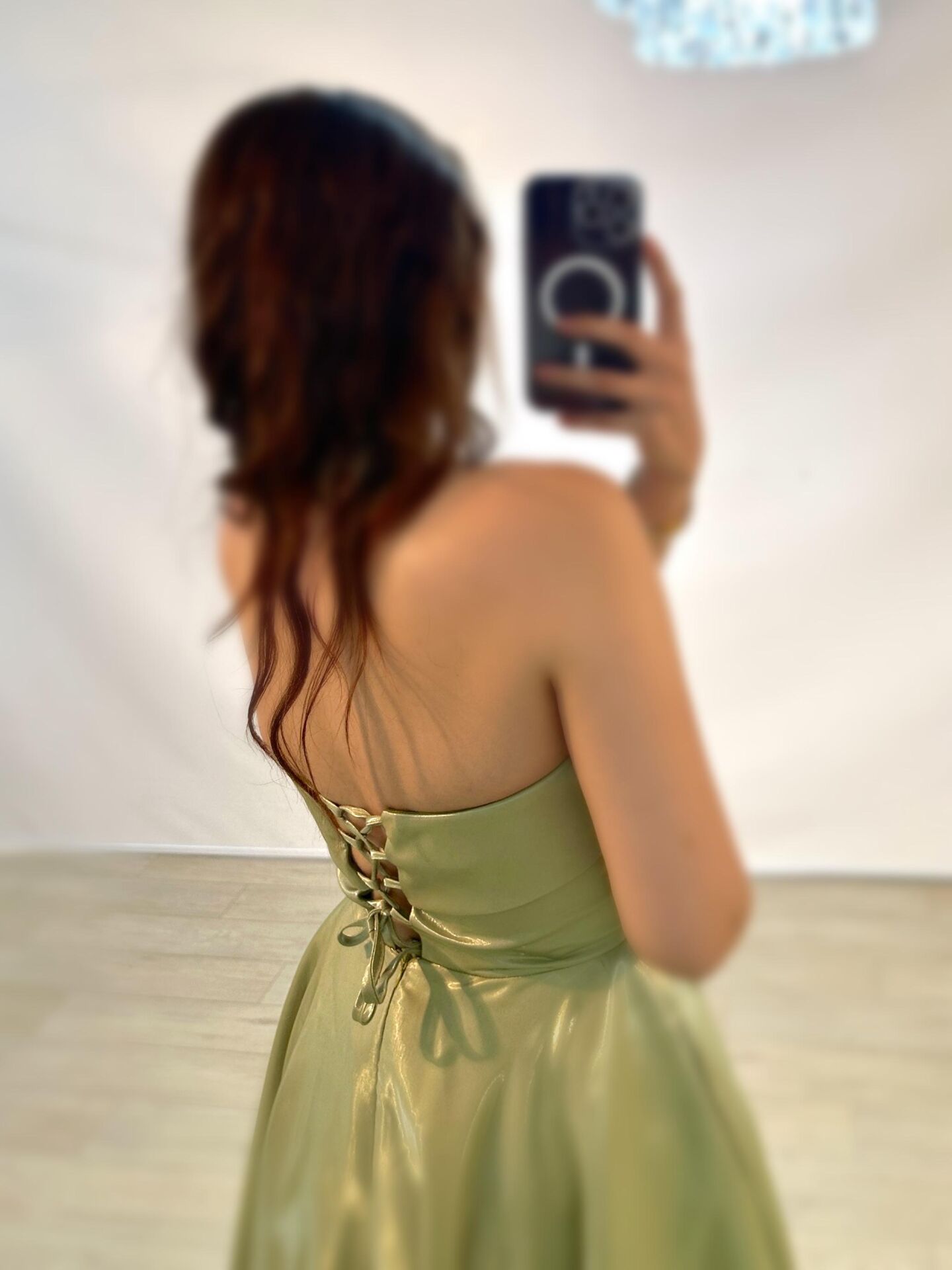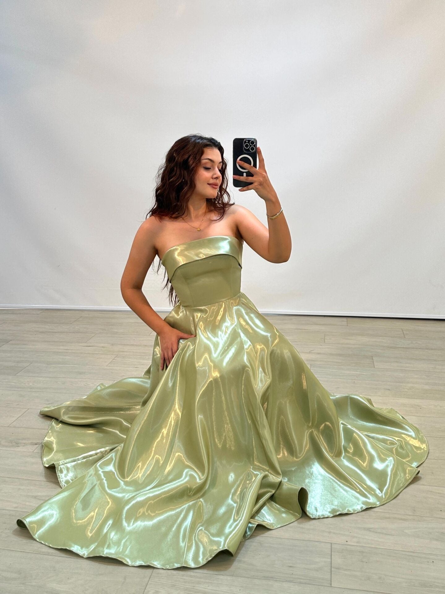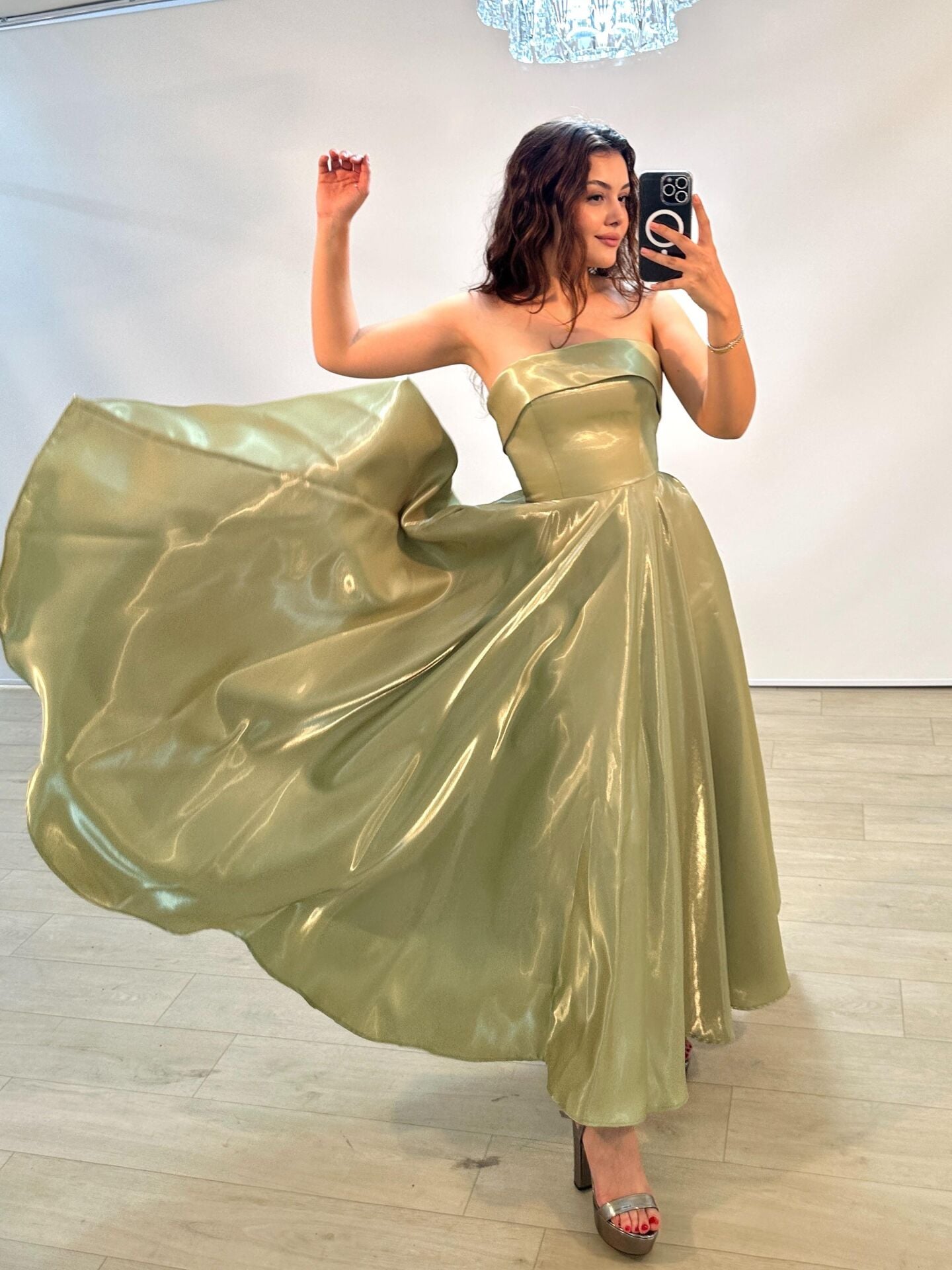 Stella Hologram Saten Straplez Fıstık Yeşili Renk Abiye Elbise 36