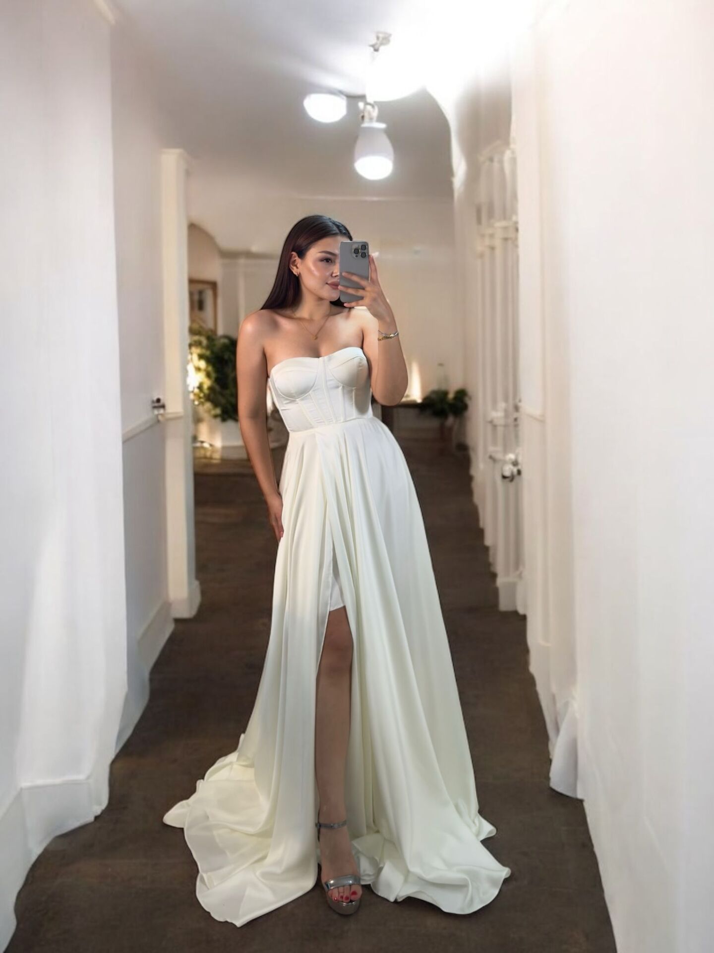 Zaris Saten Korse Ve Yırtmaç Detaylı Beyaz Abiye Elbise