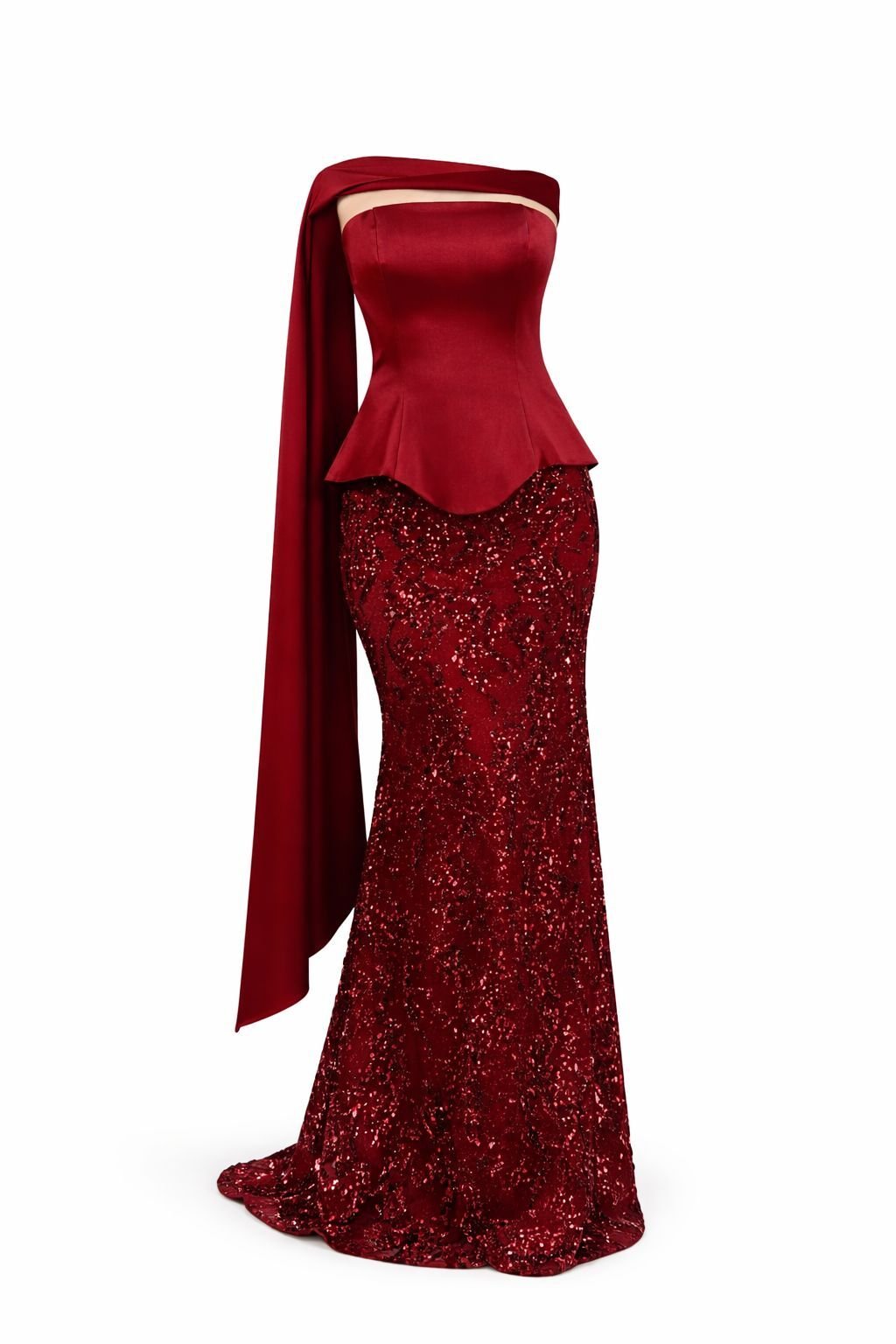 İrina Fular Ve Eldiven Detaylı Dantel Üzeri Payet İşlemeli Korseli Bordo Abiye Elbise