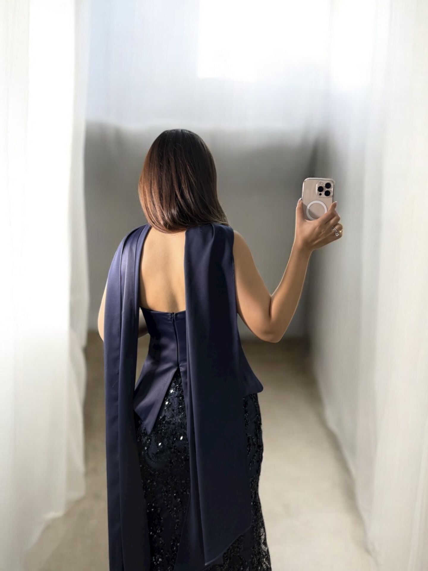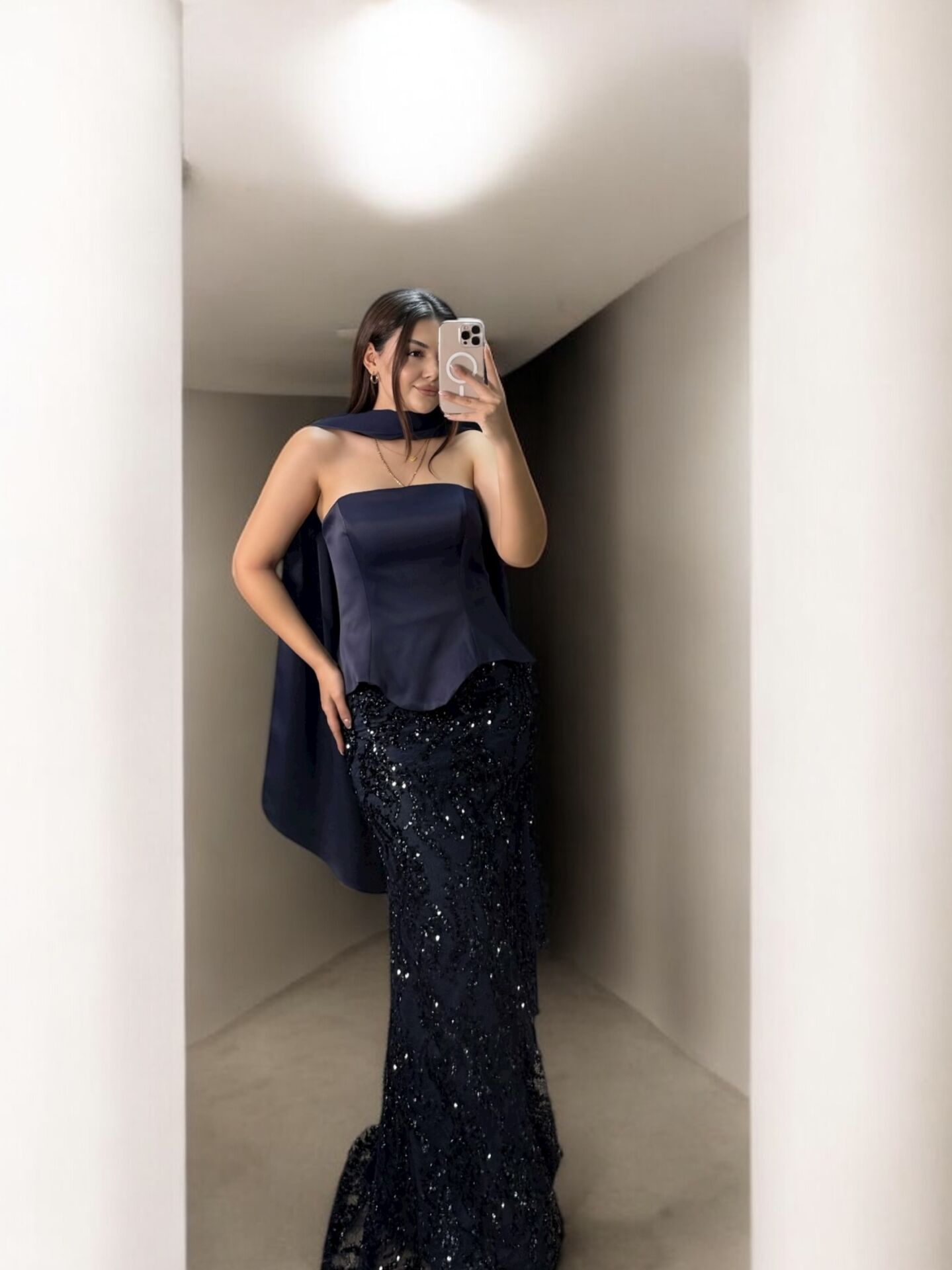 İrina Fular Ve Eldiven Detaylı Dantel Üzeri Payet İşlemeli Korseli Lacivert Abiye Elbise 36