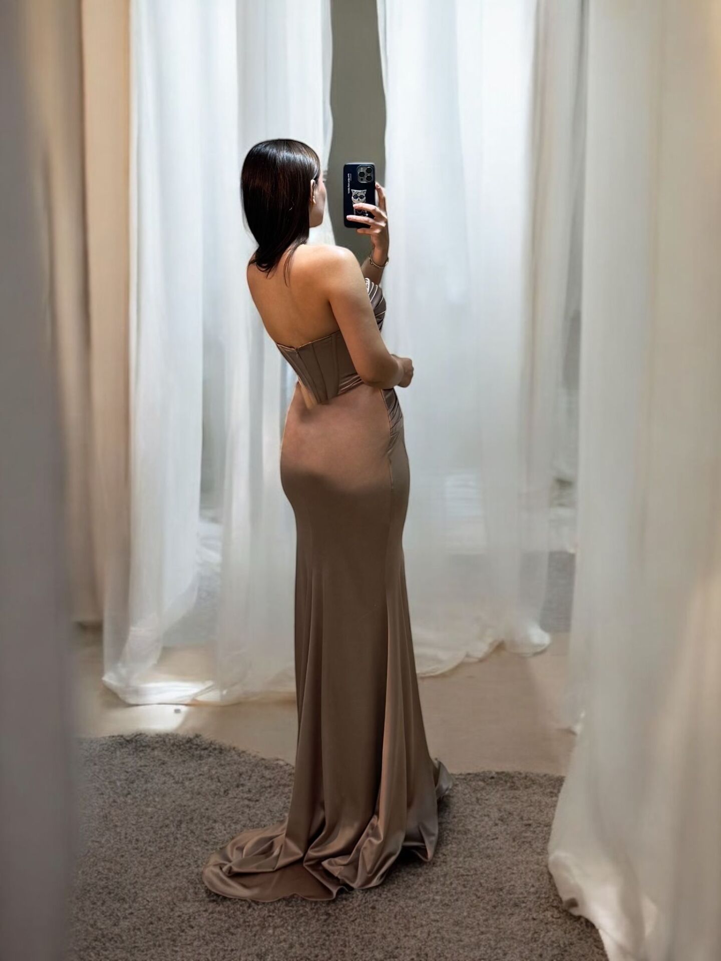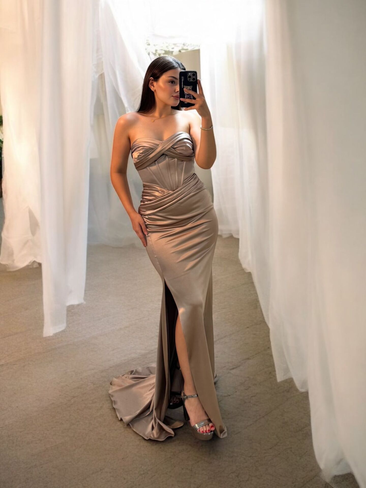 Aura Korseli Balık Model Saten Straplez Vizon Renk Abiye Elbise 36