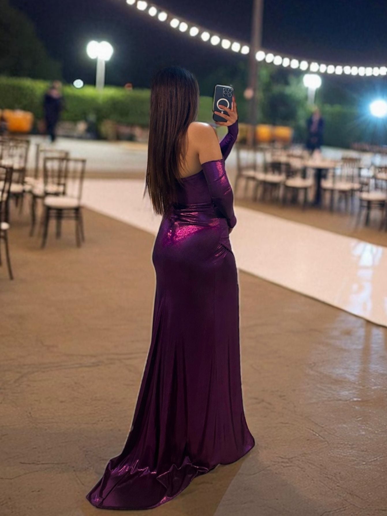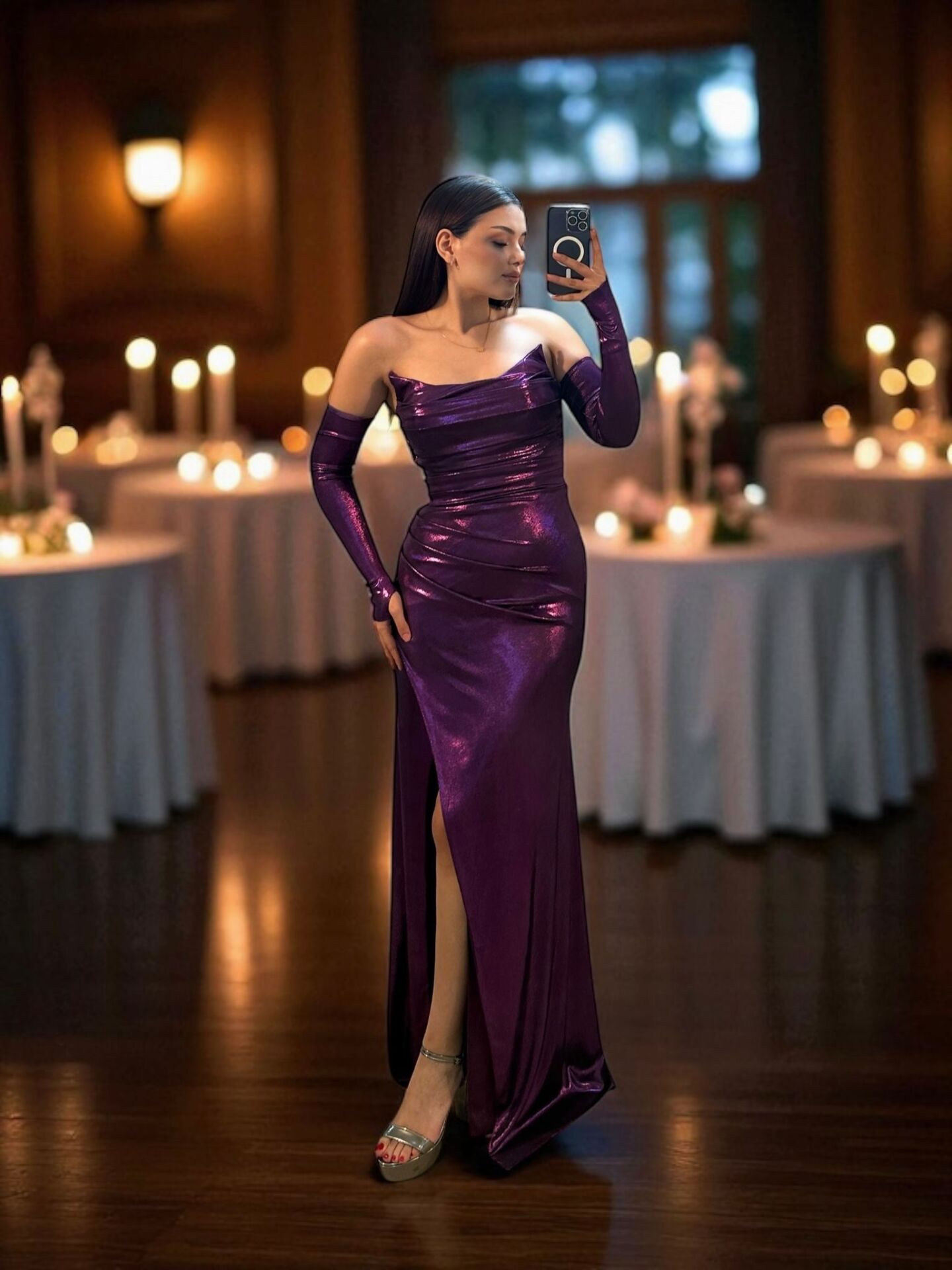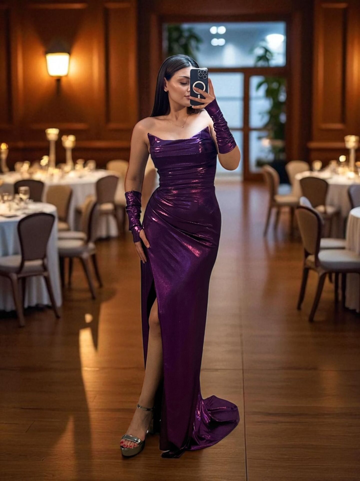 Lame kumaşı ve vücuda oturan kesimiyle dikkat çeken abiye elbisemiz beli saran detaylı tasarımı ve uyumlu eldivenleri ile şıklığı ön plana çıkarıyor. Parlak mor dokusu ve dikkat çekici eldivenleriyle gecenin en iddialı ismi siz olun.