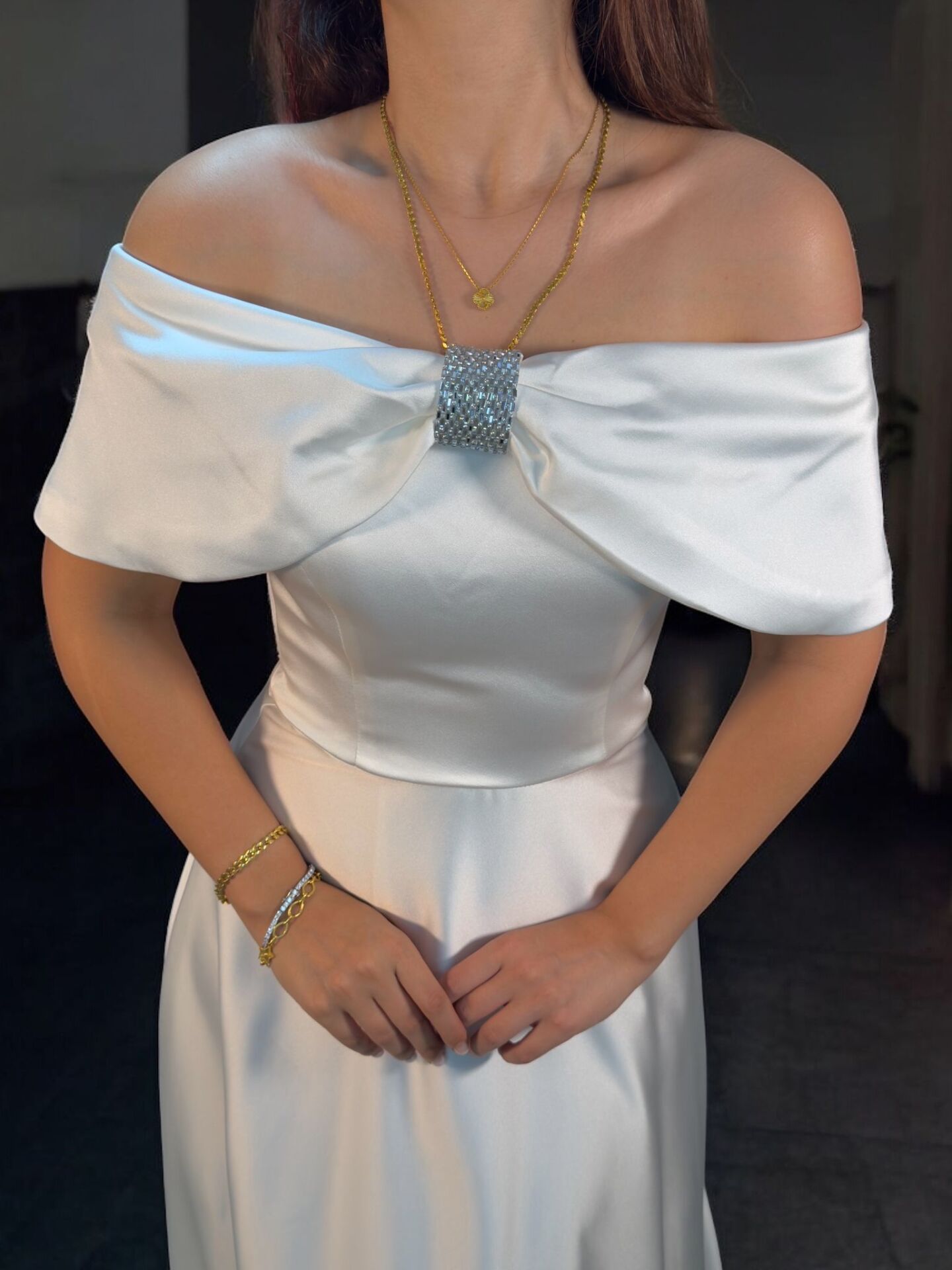 Bu muhteşem Madonna yaka abiye elbise, özel günlerinizde sizi zarif ve şık gösterecek. Pamuk saten kumaşıyla rahatlık sunarken, A kesim eteği ve bele oturan kesimiyle de vücudunuza uyum sağlayacak. Bu elbise sayesinde herkesin gözü üzerinizde olacak!| Renk | : | Beyaz |