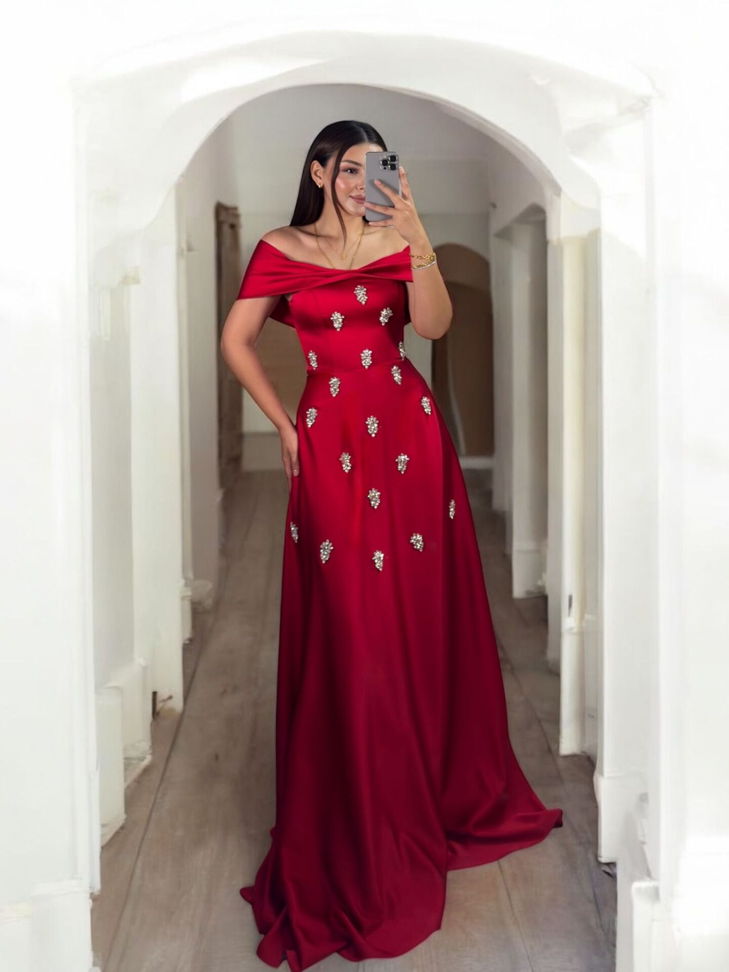Madonna Zirkon Taşlı Saten Kırmızı Renk Abiye Elbise 36
