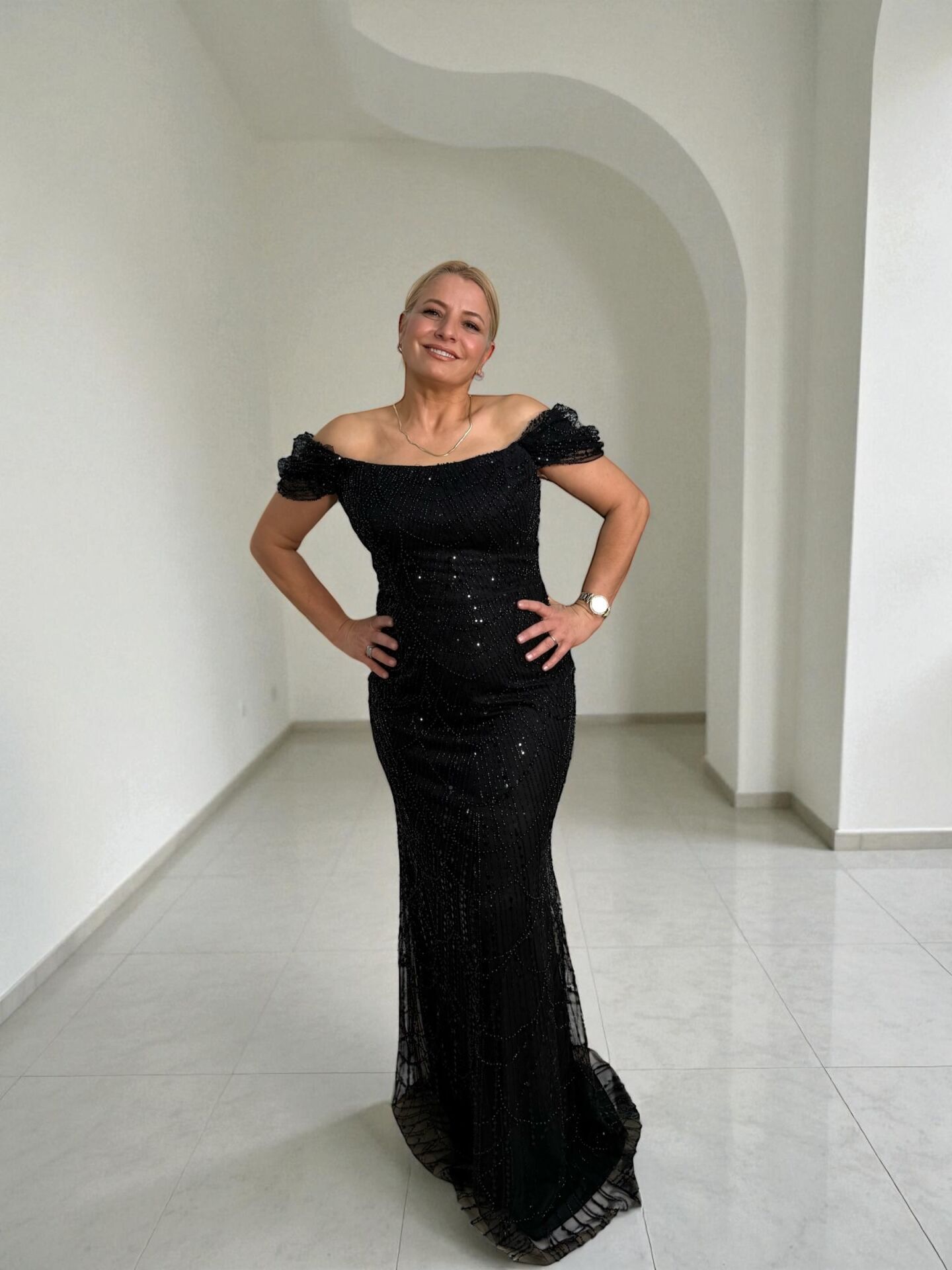 Modest Boncuk Ve Payet İşlemeli Prenses Kollu Siyah Rengi Abiye Elbise