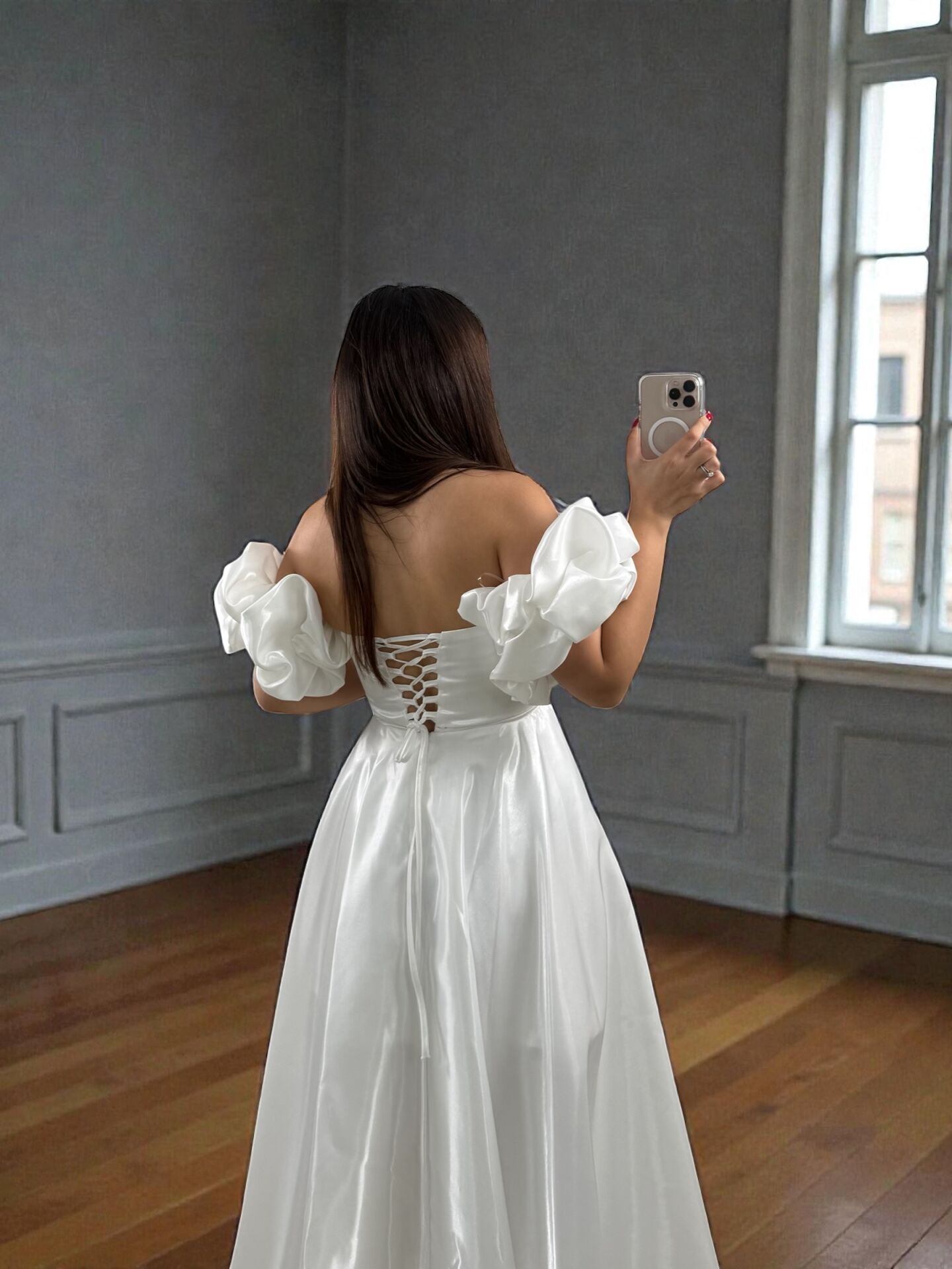Nora Balon Kollu Parlak Saten Yırtmaçlı Beyaz Abiye Elbise 36