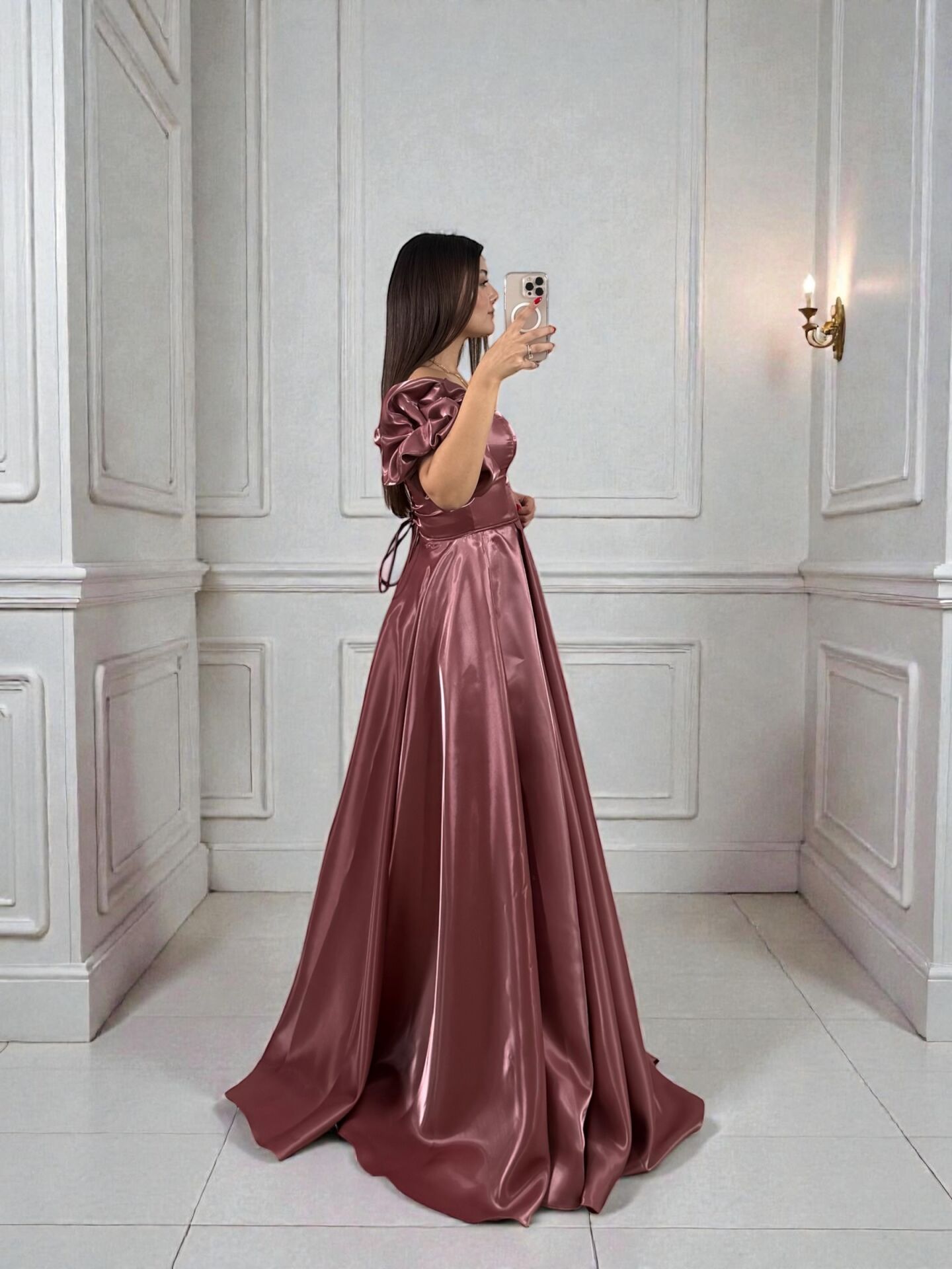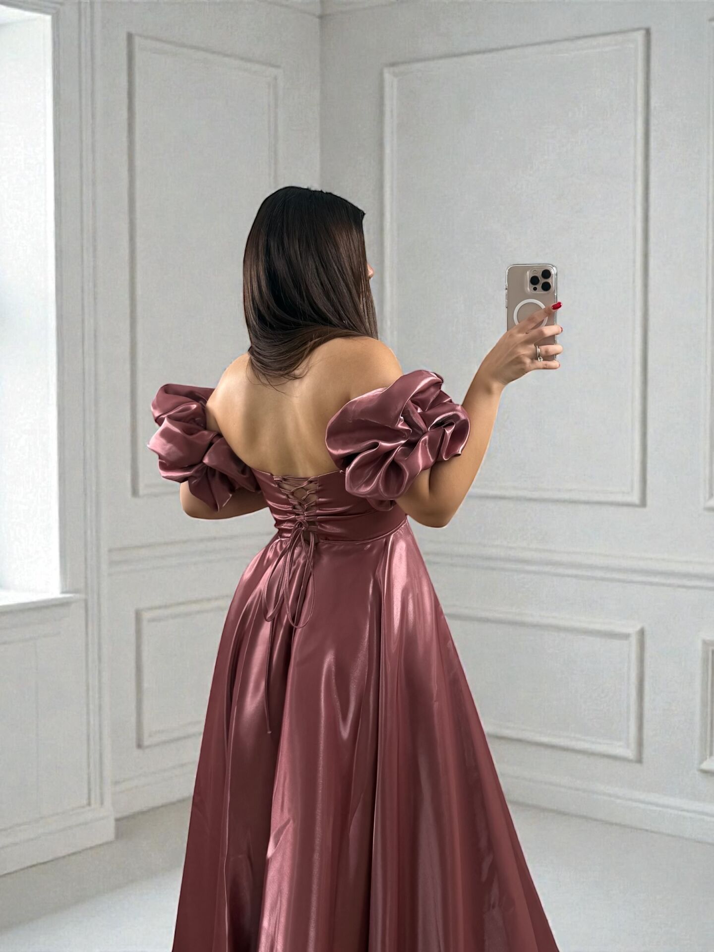 Nora Balon Kollu Parlak Saten Yırtmaçlı Gül Kurusu Abiye Elbise 36