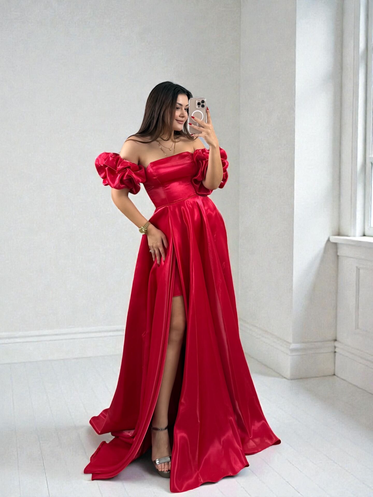 Nora Balon Kollu Parlak Saten Yırtmaçlı Kırmızı Abiye Elbise 36