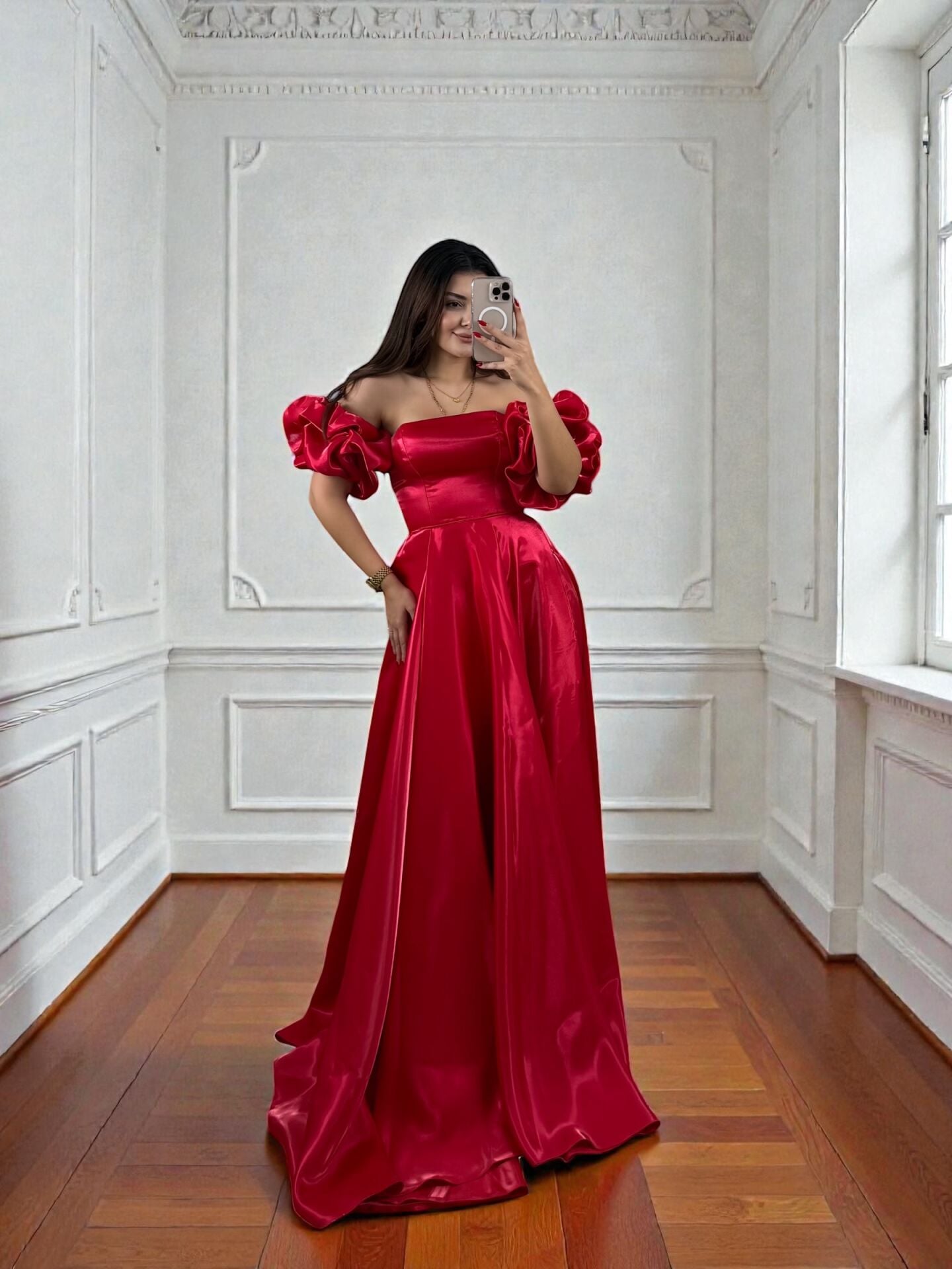 Nora Balon Kollu Parlak Saten Yırtmaçlı Kırmızı Abiye Elbise 40