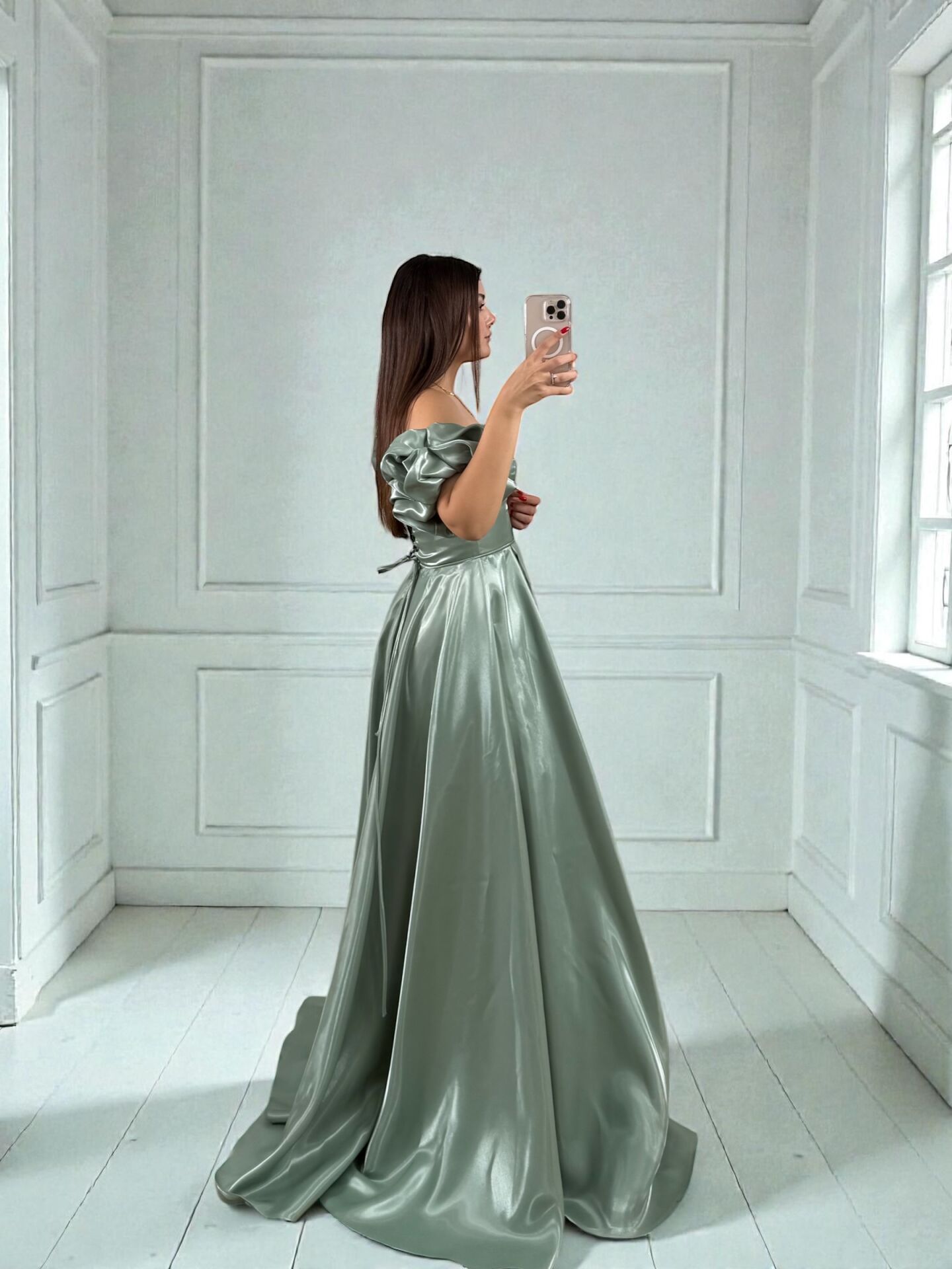 Nora Balon Kollu Parlak Saten Yırtmaçlı Mint Yeşili Abiye Elbise