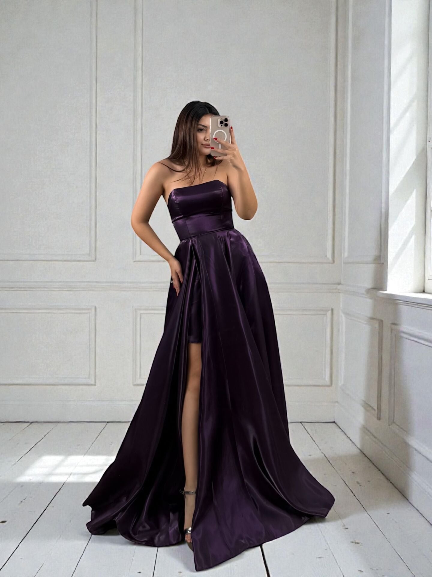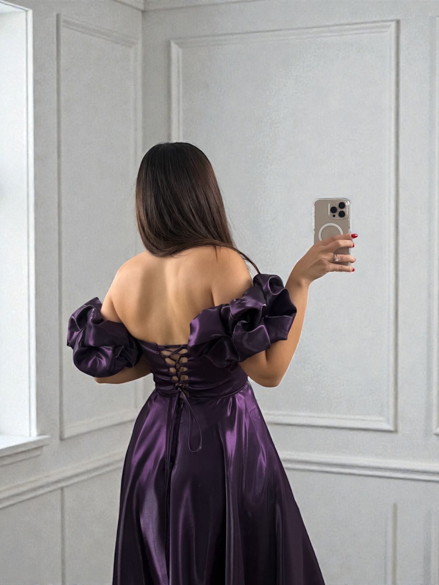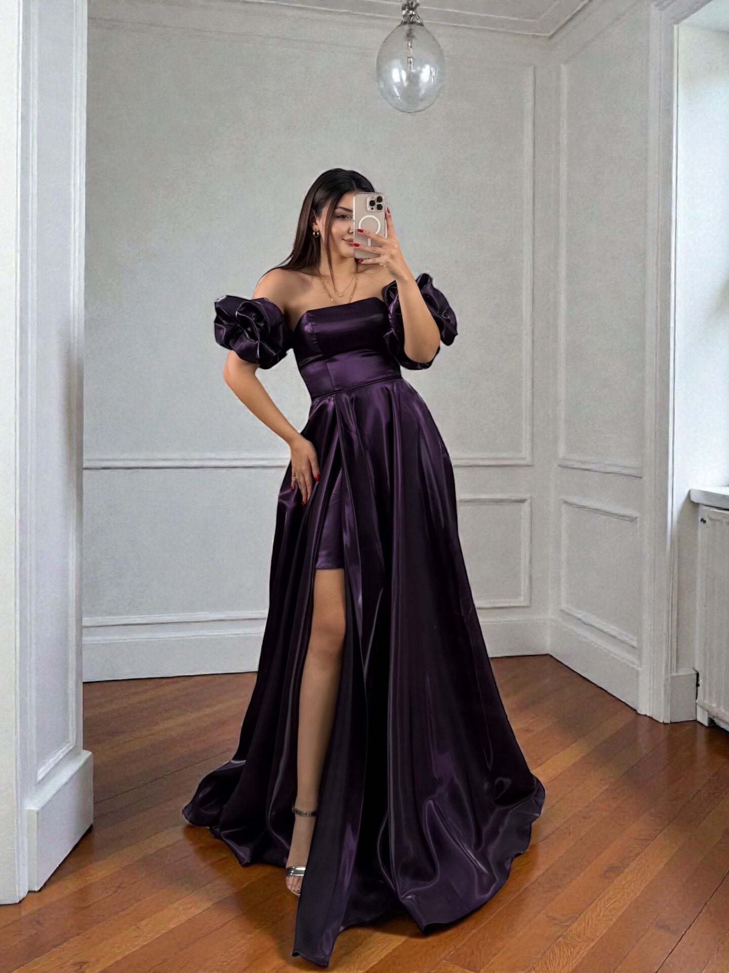 Nora Balon Kollu Parlak Saten Yırtmaçlı Mor Abiye Elbise 36