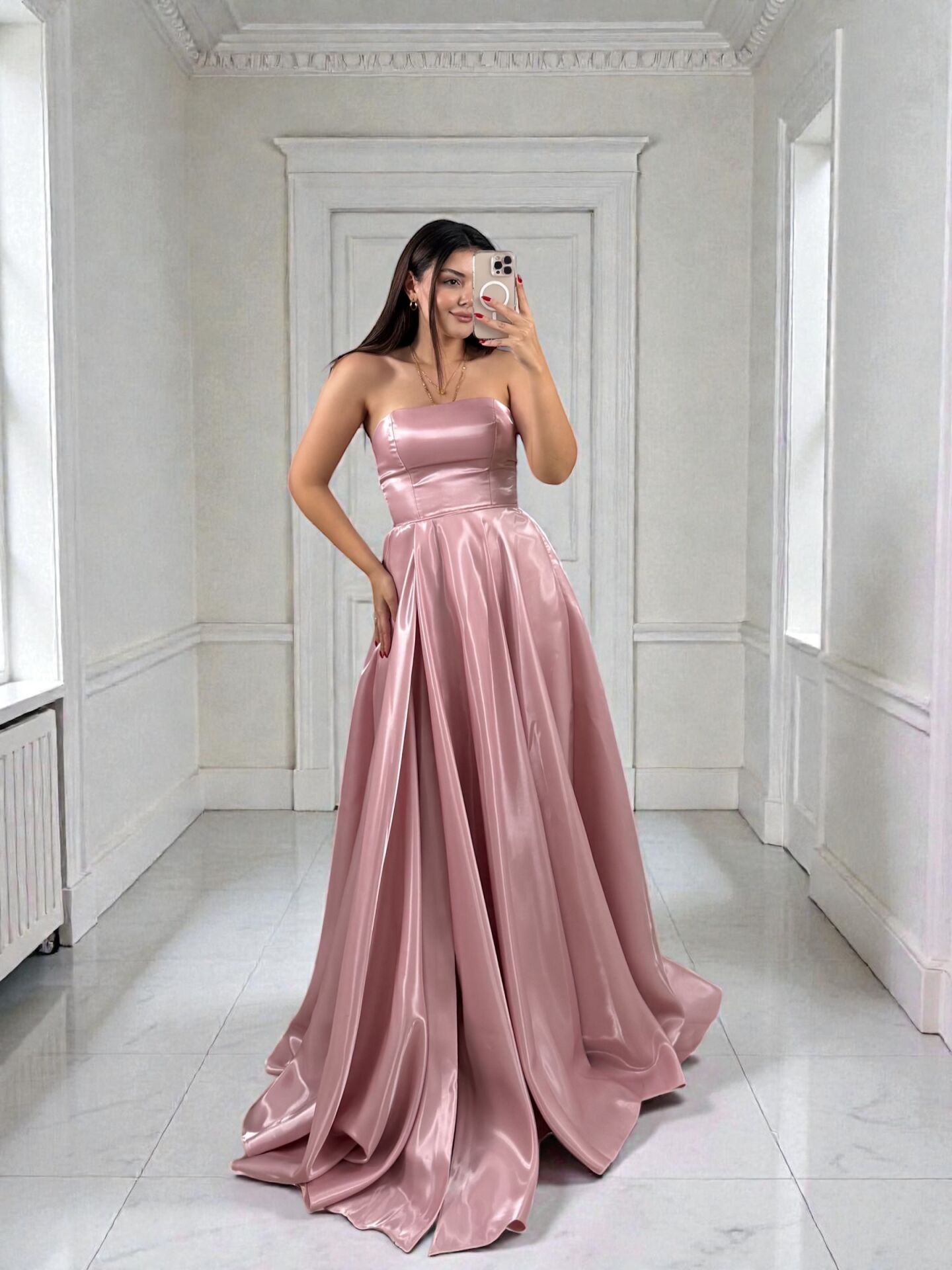 Nora Balon Kollu Parlak Saten Yırtmaçlı Pudra Pembe Abiye Elbise 36