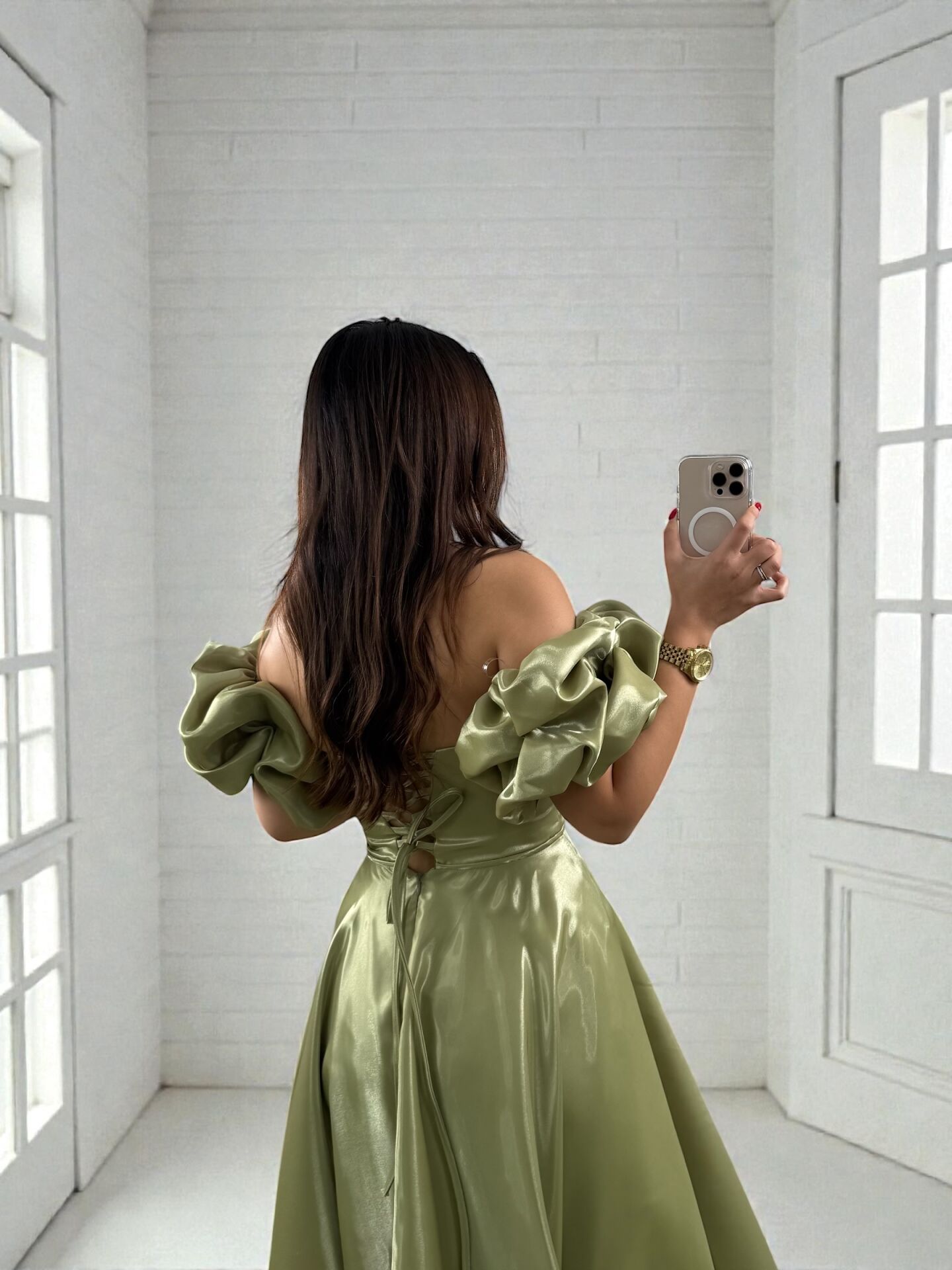Nora Balon Kollu Parlak Saten Yırtmaçlı Su Yeşili Abiye Elbise 36