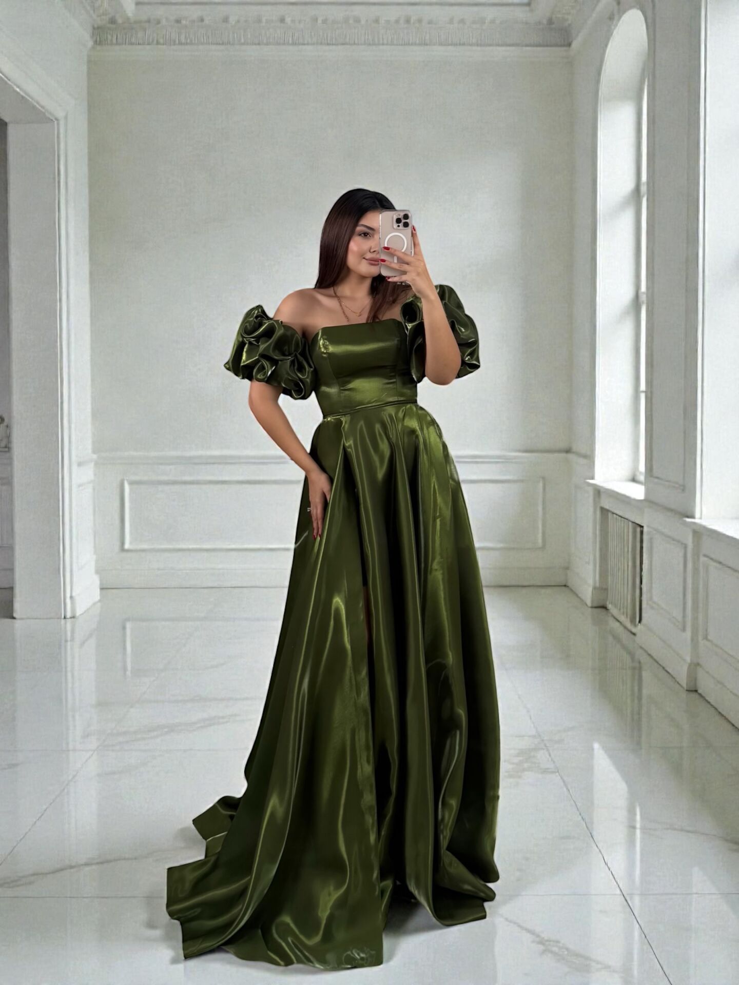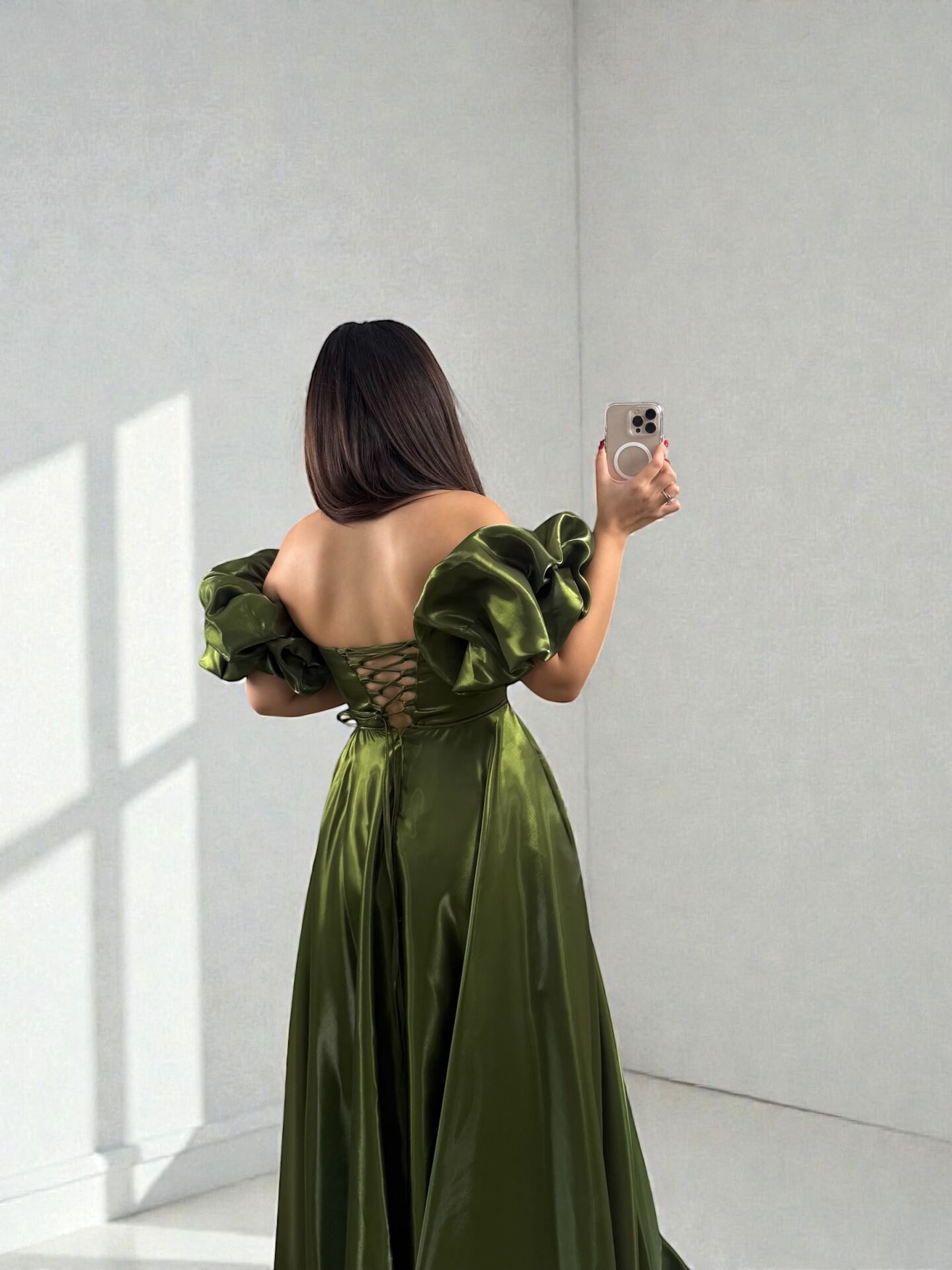 Nora Balon Kollu Parlak Saten Yırtmaçlı Yeşil Abiye Elbise 36